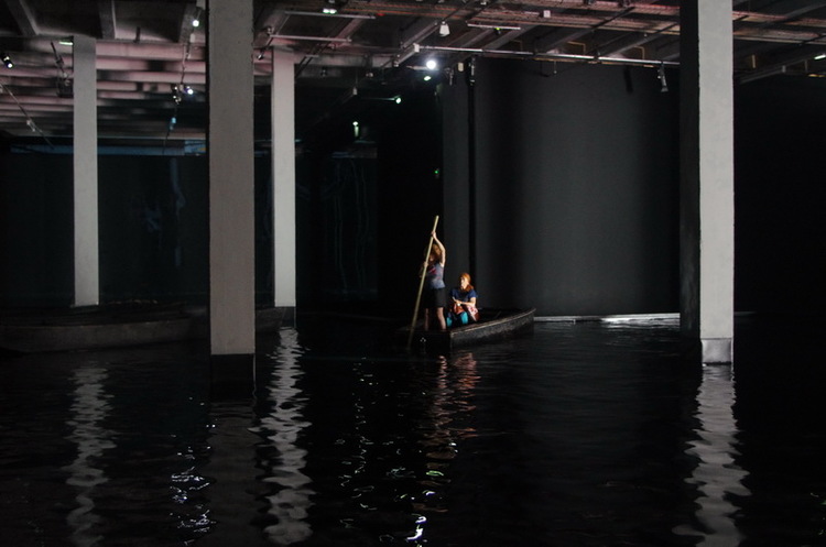 Gli spettatori diventano anch’essi protagonisti: i loro movimenti, infatti, vengono filmati e trasmessi in presa diretta sulle pareti di questo spazio dove l’acqua ha riempito le stanze sino all’altezza delle colonne. Visitatori e attori, dunque, che finiscono poi per ritrovarsi su di un’isola al centro della mostra.