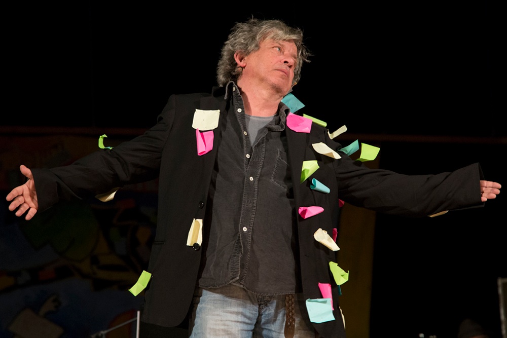 Opinioni di un clown è dunque il punto di partenza per raccontare i giorni nostri di un Paolo Rossi – Arlecchino del terzo millennio: nevrotico e surreale (coperto di post-it colorati al posto delle pezze di stoffa della maschera originale). Fare della Commedia dell’Arte uno spettacolo contemporaneo è la sfida lanciata dal palcoscenico. Improvvisazione e interazione con il pubblico incluse.