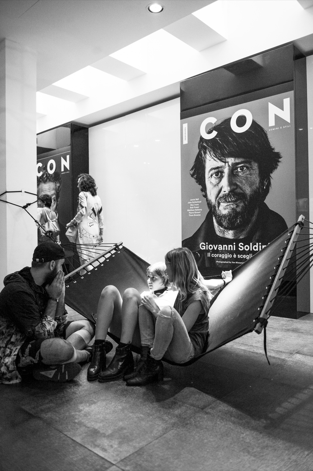 Un'amaca all'ingresso dello Spazio Ex Cobianchi invitava gli ospiti a dondolarsi leggendo l'ultimo numero di Icon