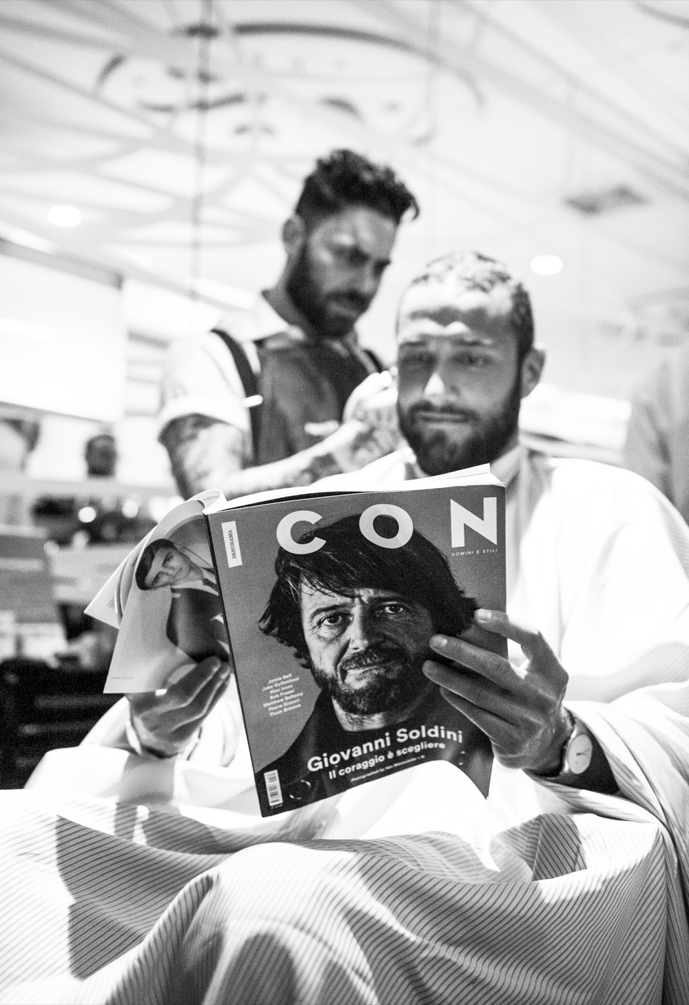 Un ospite della serata mentre regola barba e capelli sfogliando l’ultimo numero di Icon