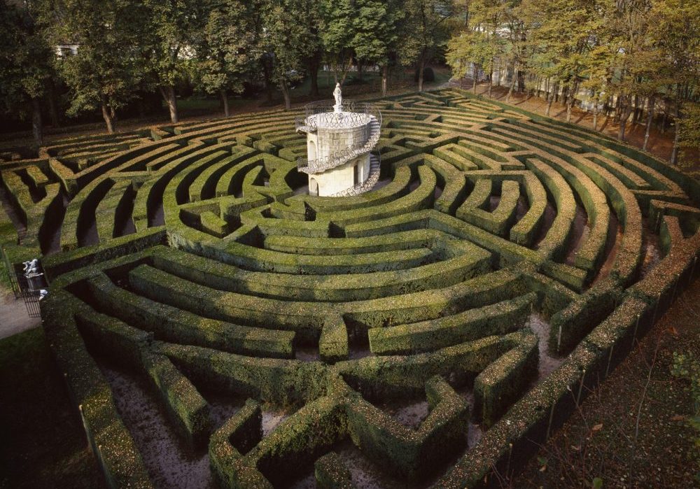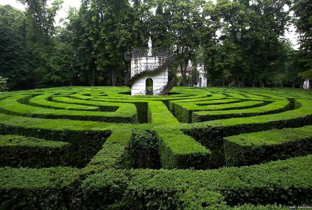 Iniziamo il nostro viaggio a Villa Pisani a Stra, in provincia di Venezia, dove possiamo trovare quello che è stato definito uno dei più ‘difficili’ labirinti del mondo. Conosciuto fin dai tempi di Napoleone e citato in molte opere di letteratura tra cui l’opera di Gabriele D’Annunzio, Il Fuoco, il Labirinto di Villa Pisani è stato costruito nel 1722, a opera dell’architetto Girolamo Fringimelica, che ideò un rompicapo composto da nove cerchi concentrici, costituiti da siepi di carpino, poi sostituite nell’Ottocento da siepi di bosso, con al centro una torretta dotata di una doppia scala elicoidale, per confondere ancora di più i visitatori. Il labirinto è nato per scopi ludici, cioè per una specie di gioco che consisteva nel perdersi e poi ritrovare per primi l’uscita per avere in cambio un premio. A rendere il tutto più difficile, strade senza uscita e vicoli ciechi.