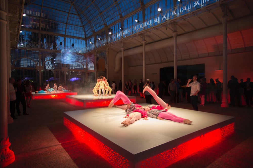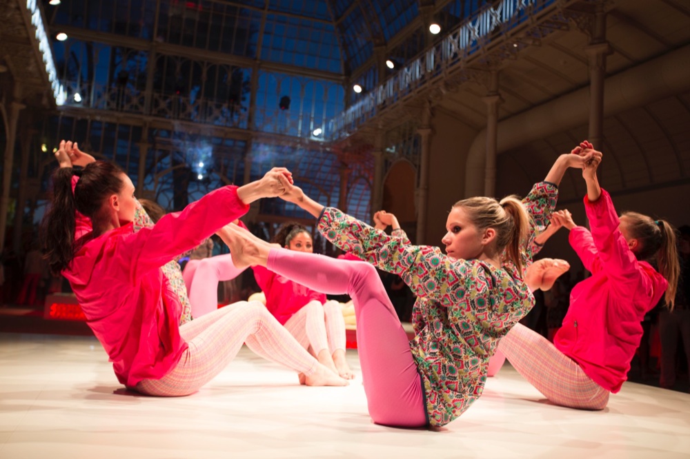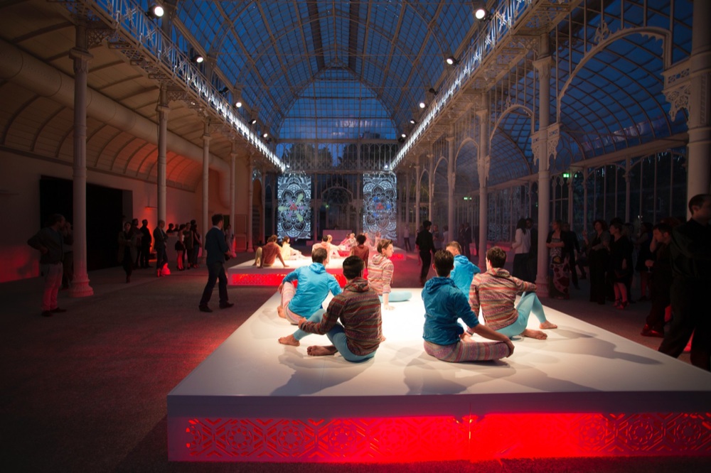Al centro dei 650 metri quadrati della location, tre pedane incise con i tradizionali mandala nepalesi, si sono trasformate in palcoscenici su cui 18 ballerini professionisti, vestendo i capi della prossima stagione estiva, si sono esibiti in una performance live trasmessa in loop sui megaschermi.