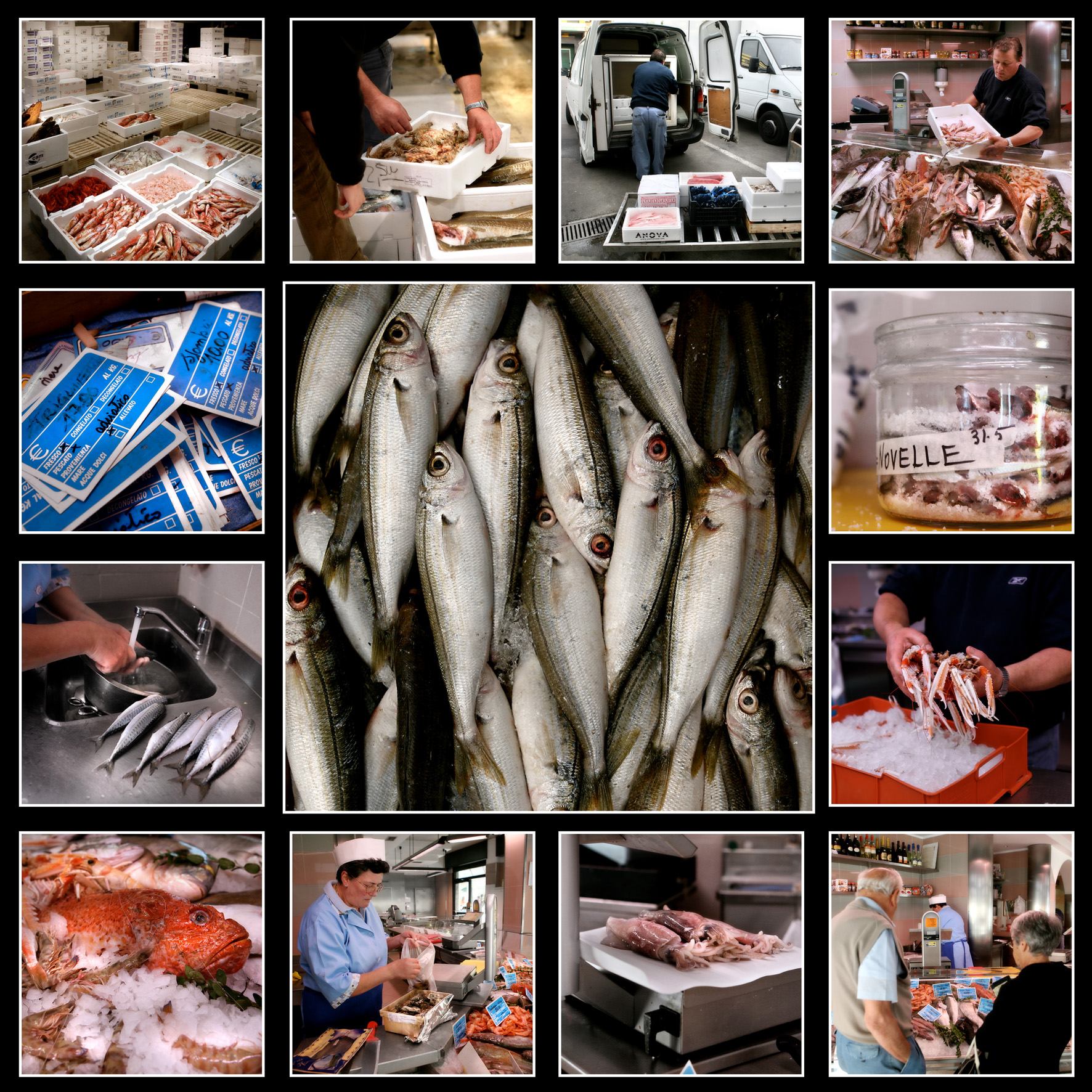 Sono collage di contenuto alimentare quelli che Raoul Iacometti ha composto raccogliendo le sue tessere iconografiche da drogherie, pescherie e pasticcerie.