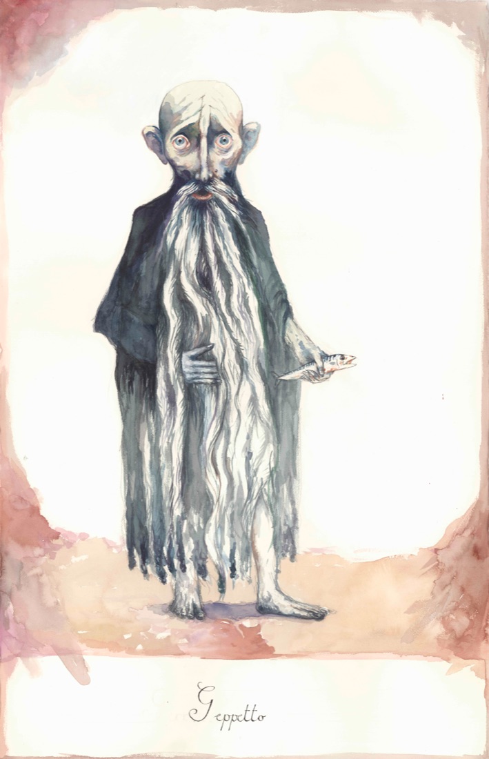42 opere in mostra tra acquarelli, disegni e sculture che raccontano il periodo trascorso da Geppetto nel ventre della balena, e i ritratti dei personaggi principali. Spiega Carey : ‘Geppetto è un artista – racconta ancora Edward Carey – un inventore. È talmente povero da nonpotersi permettere un fuoco e ne ha dipinto uno sulla parete; e, ovviamente, la sua più grande creazione è suo figlio. Ho iniziato a immaginare che cosa Geppetto avesse mai potuto creare: busti di se stesso e di Pinocchio fatti di gallette masticate trovate nella barca; un ritratto di un granchio, suo compagno lì nel ventre; gli ho fatto dipingere donne conosciute durante la giovinezza su pezzi di legno alla deriva; gli ho fatto dipingere un grande cielo su un osso di balena, che lui chiama ‘finestra’, quando finisce l’inchiostro vero, Geppetto usa quello di seppia per fare un autoritratto’.