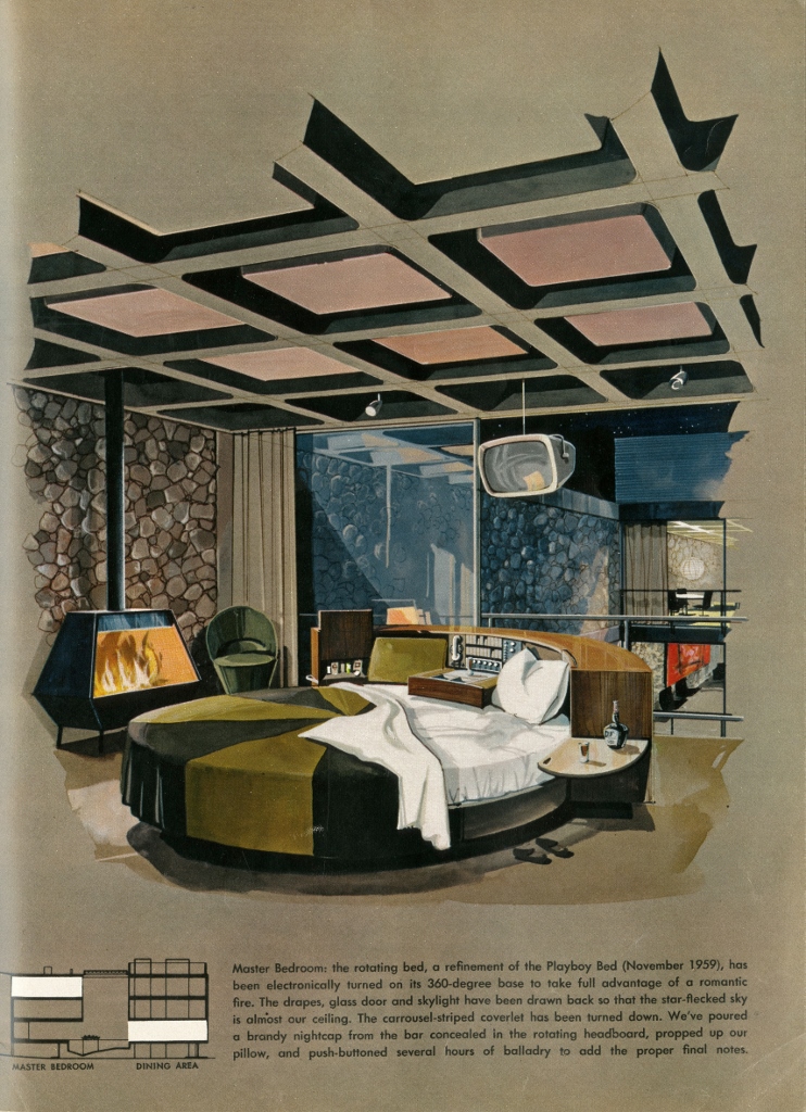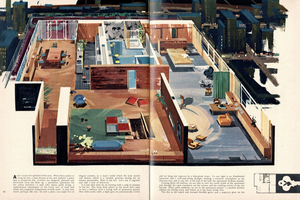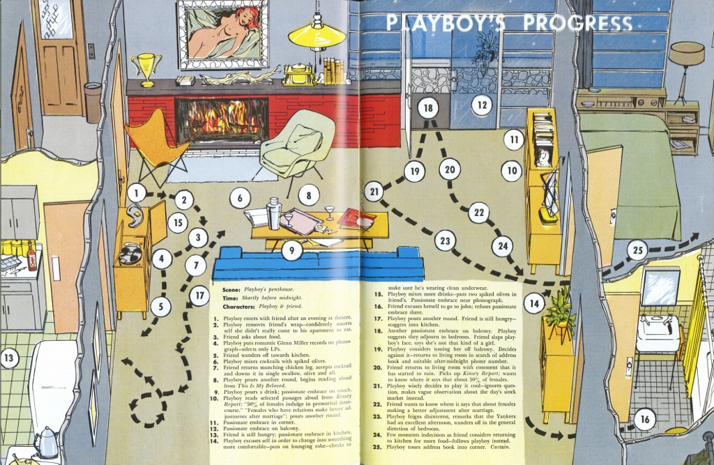 Dalla prima uscita nel 1953 fino al 1979, Playboy ha infatti dedicato spazio anche a temi di politica, letteratura, musica, arte e architettura, mostrando un atteggiamento estremamente progressista. Accanto alle fotografie erotiche si trovano interviste con architetti come Frank Lloyd Wright e Mies van der Rohe, contributi sulla teoria dell’architettura, disegni dell’appartamento ideale per l’uomo emancipato e moderno, mentre le playmate posano su sedie di Charles Eames, Eero Saarinen o Harry Bertoia.