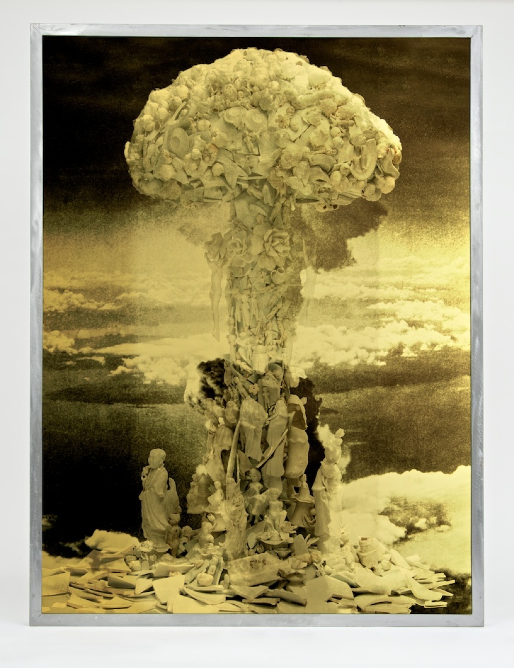Un fungo di panna montata, in realtà la rappresentazione scultorea di un’esplosione atomica, è il pezzo forte di una tavola apparecchiata per 12 commensali. A guardare bene il fungo è composto da un coacervo di sculturine in porcellana, tra cui un Cristo crocefisso, una Guan Yin e la miniatura di un lavabo da cucina.