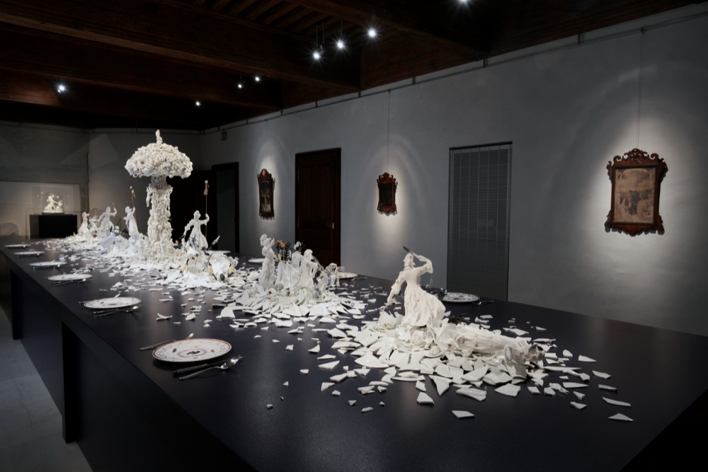 Sulla tavola si svolge un’acre battaglia di figurini in zucchero dagli arti costruiti con pezzi di robot di plastica, tra i frammenti di vasellame in frantumi. Si chiama War and Pieces, originariamente commissionata dal museo Holburne a Bath, è l’opera più imponente della personale dell’artista di origini olandesi Bouke de Vries che si dipana per le stanze del castello delle porcellane di Nyon, a nord di Ginevra.