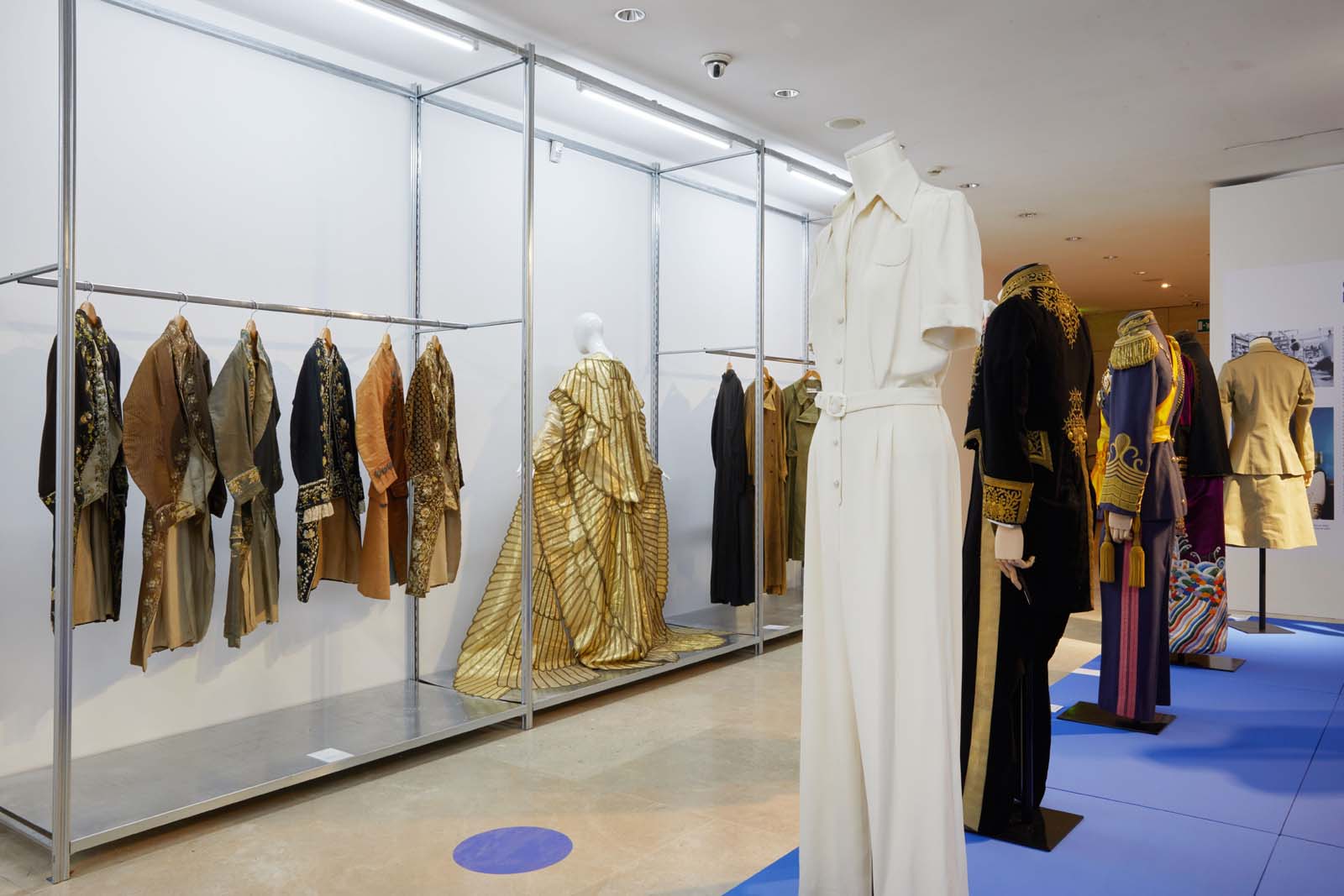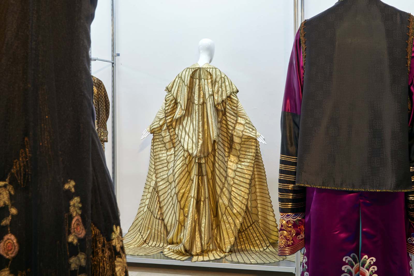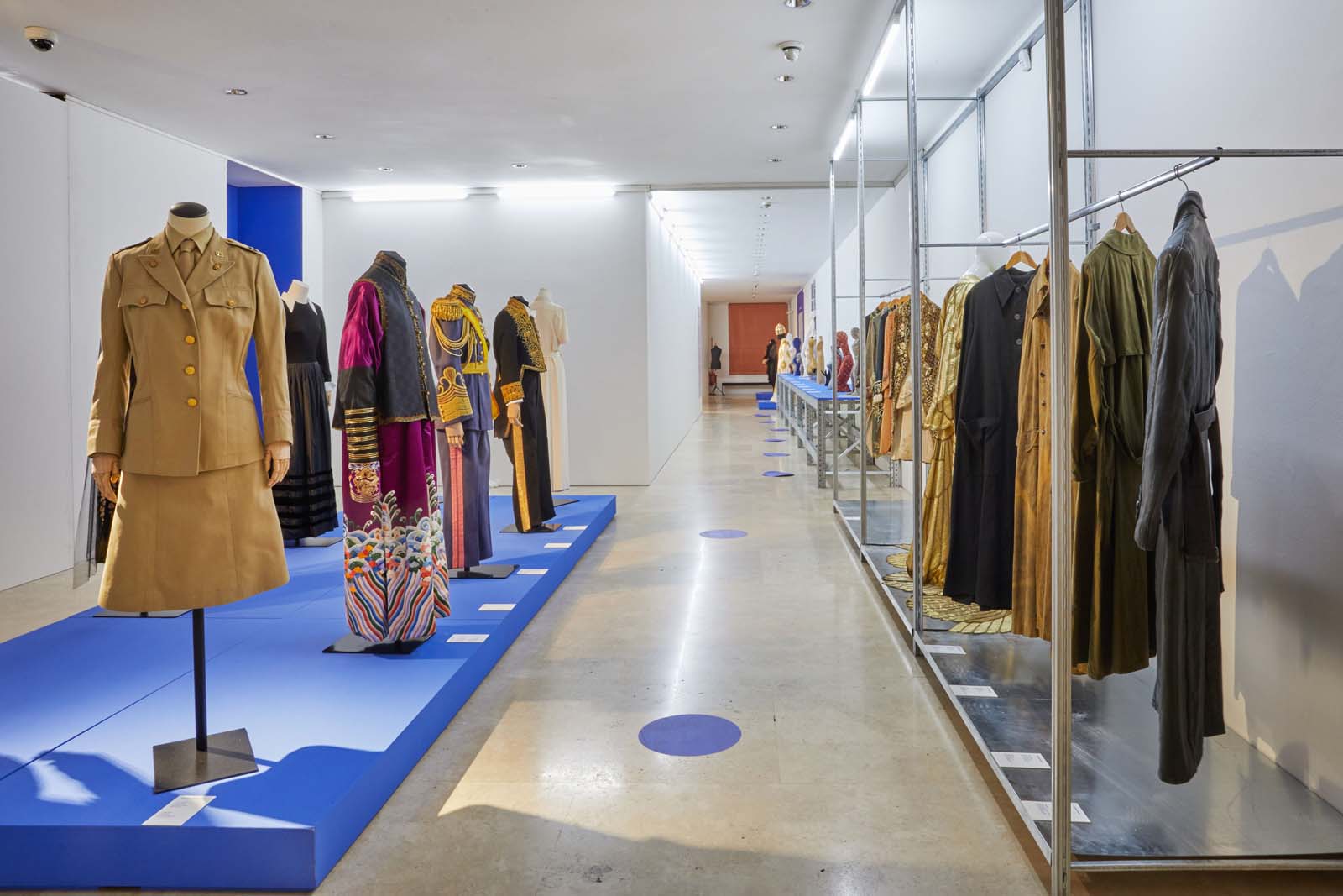 La mappa che apre il percorso espositivo consente di localizzare i vari atelier sparsi per la città, tratteggiando i confini di un museo della sartoria di Costume a cielo aperto. Si prosegue poi con un tuffo negli ambienti di un laboratorio ricreato per l’occasione, dove gli scampoli di tessuto e le strutture metalliche a muro dialogano con i manichini che indossano alcuni dei costumi più celebri del cinema.