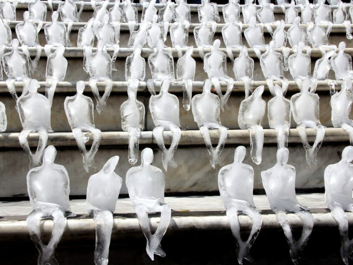 Decisamente meno macabro è il lavoro scultoreo di Néle Azevedo (1950), un’artista brasiliana che vive e lavora a Sao Paulo ma ha riempito le città di mezzo mondo con il suo straordinario monumento ‘melting men’ Minimum Monument. Questi piccoli uomini consistono in sculture di ghiaccio con sembianze umane sedute sugli scalini delle piazze e dei monumenti. La posizione del corpo segue una movenza contemplativa, così sembra che queste figure siano in attesa di un avvenimento comune. La scelta del ghiaccio, materiale deperibile, è studiata alla perfezione per rappresentare la singolarità del momento e l’effimerità dell’esistenza.
