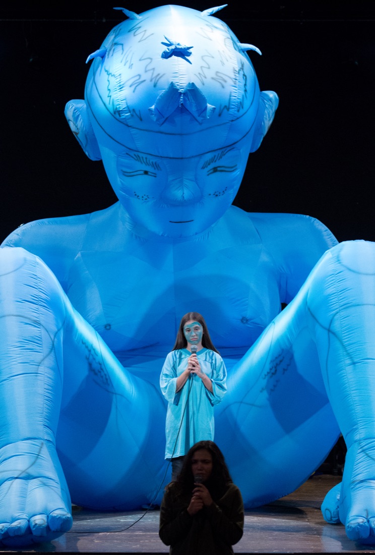 Poi succede che la regista Eleonora Pippo legge il fumetto e se ne innamora. Vuole portarlo in scena sia per il suo straordinario potere evocativo sia perché dà voce a una socialità diversa. ‘Il tema, prima di tutto, mi è sembrato di grande attualità. Parla di due amiche adolescenti che hanno la passione per le analisi mediche. Il motivo è che quel pezzo di carta rappresenta per loro la prova materiale della propria esistenza. Gli adulti risultano inadeguati e il confronto – necessario in ogni epoca – viene meno insieme alla definizione di se stessi‘, spiega la regista. Che ha scelto di realizzare spettacoli unici in ognuna delle città in cui li ha portati in scena: le attrici sono ragazze del posto che, oltre a recitare il copione (esattamente le parole del fumetto), pensano alla colonna sonora (cantata ed eseguita dal vivo). Non c’è niente di grafico in scena, solo le ragazze e il pubblico, illuminato come il palco stesso e parte dello spettacolo. Alla fine c’è un enorme pupazzo gonfiabile azzurro. ‘Si parla della morte in questo fumetto in un modo veramente fantastico. Diventa un fatto incontenibile, che travalica ogni confine. Ma voglio che il pubblico percepisca il fumetto come un fatto interiore. Senza che venga rappresentato’.