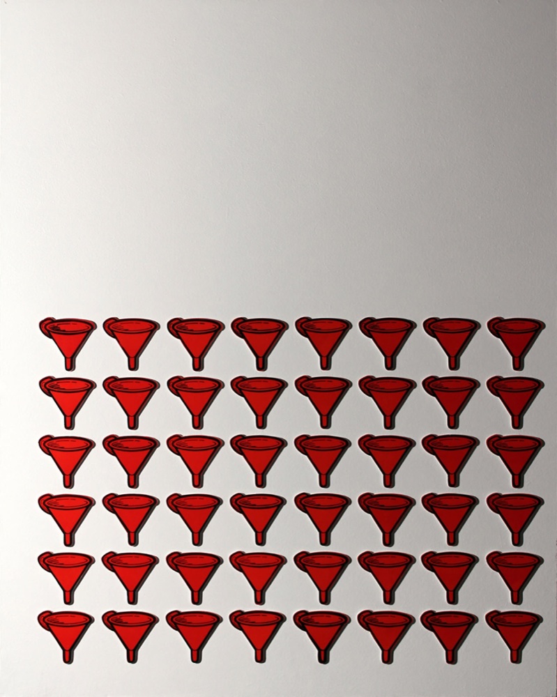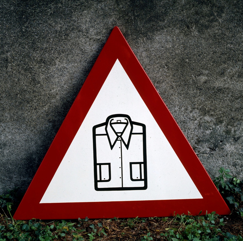 Il percorso comincia con forti suggestioni della Pop Art, per poi proseguire con i Segnali stradali regolamentari, realizzati tra il 69 e il 70, con l’inserimento ironico di oggetti-icona nei cartelli stradali, per poi passare alle tele degli anni ’70 che mostrano una metafisica senza mitologia con oggetti comuni come matite, borse per l’acqua, flaconi, imbuti, e altro, disposti su ordinate file, che dialogano con lo spazio vuoto o segnato da linee geometriche.