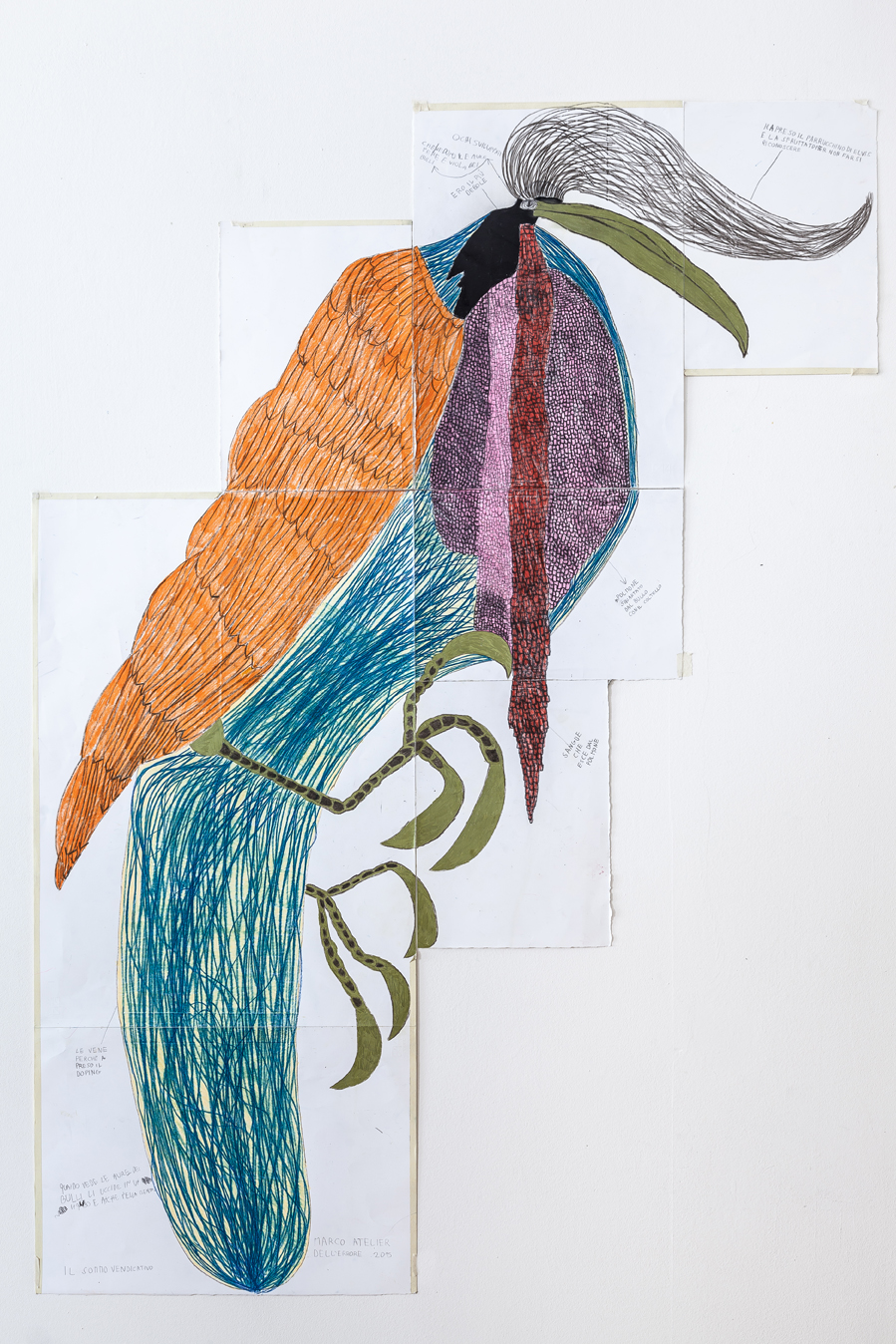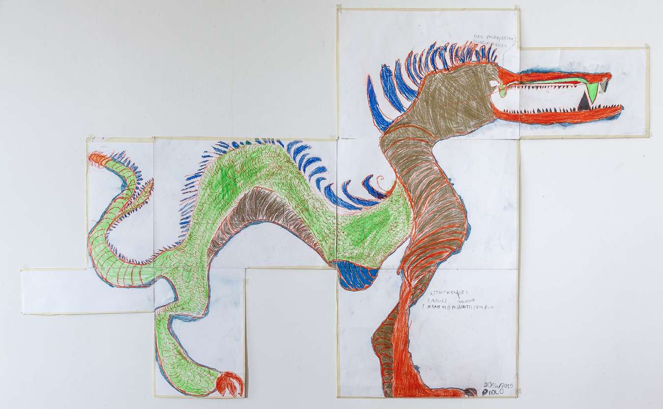 Le opere, circa una quarantina distribuite su cinque piani di un palazzo dietro Via Montenapoleone a Milano, sono frutto del lavoro dei ragazzi dell’Atelier dell’Errore, il laboratorio di arti visive fondato da Luca Santiago Mora a complemento dell’attività clinica della Neuropsichiatria infantile di Reggio Emilia. Tutte le illustrazioni, spesso realizzate collettivamente perché l’aspetto relazionale conta qui quanto la possibilità di esprimersi senza condizionamenti, hanno una forte componente narrativa: raccontano le paure e assumono possibilmente una funzione salvifica, incanalando il desiderio di rivalsa di giovanissimi stretti ai margini dalla vita quotidiana.