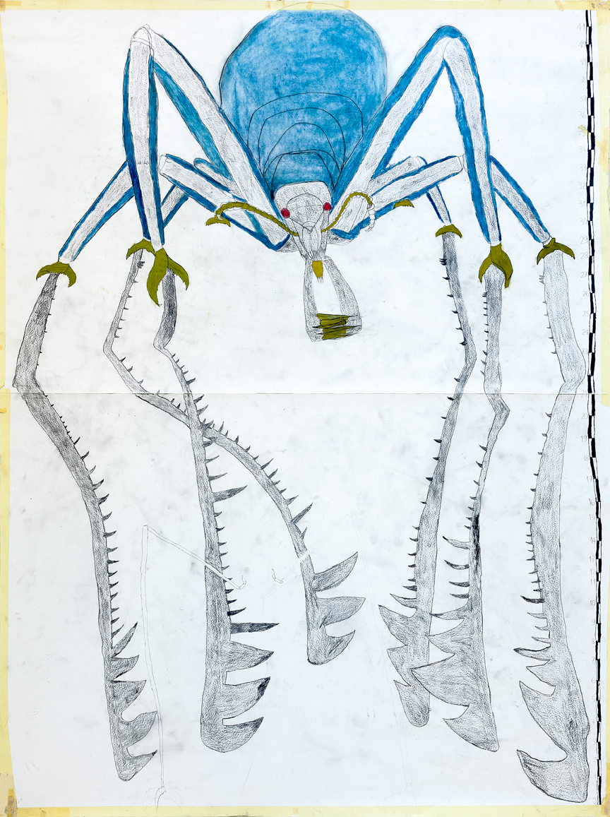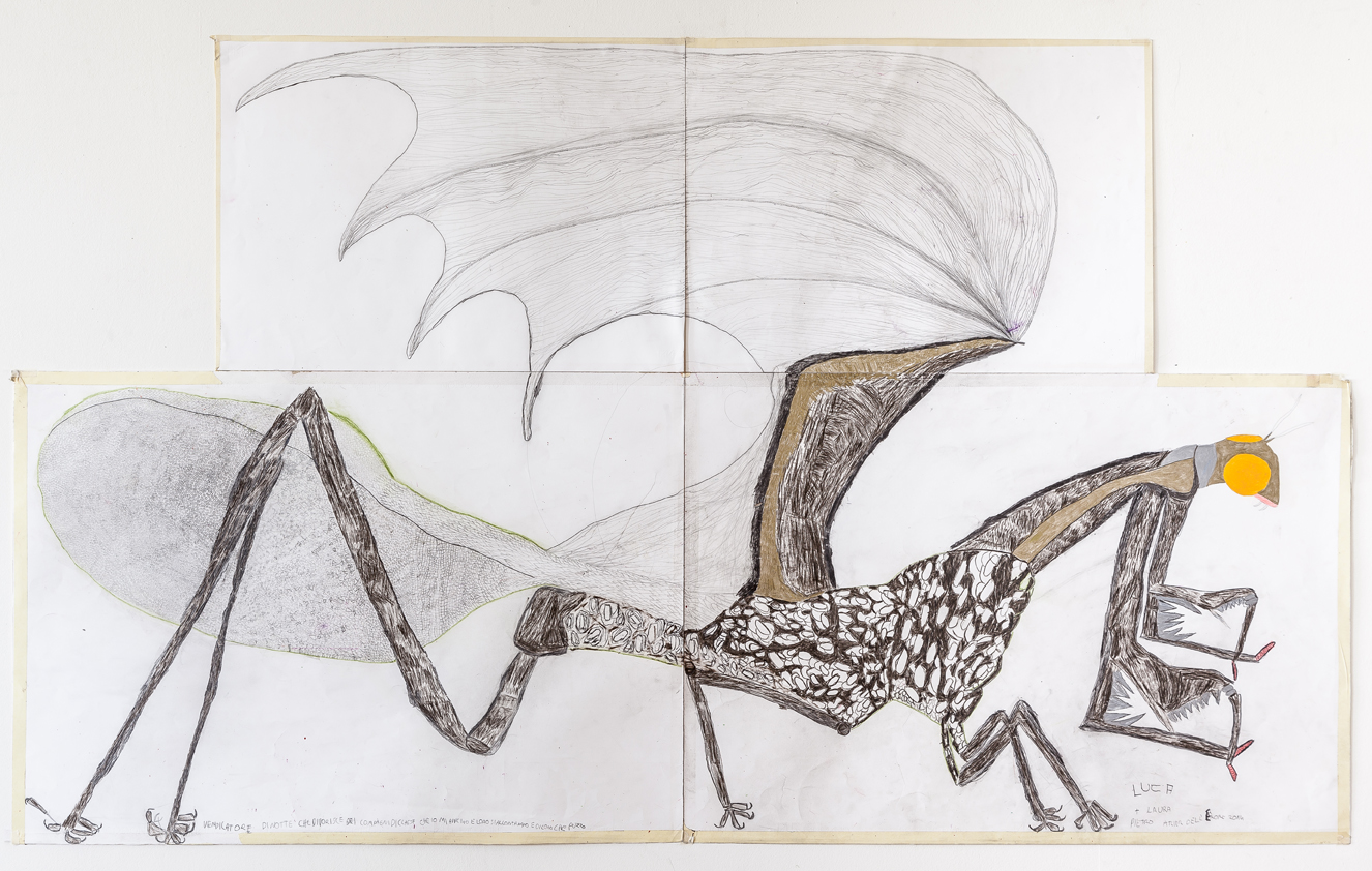 Il tema scivola quindi verso un bestiario fantastico visualizzato da disegni appesi al muro su supporti di legno senza pretese. Spaventevoli e fameliche creature vanno a caccia di umani, mostrando anche una gamma di gusti piuttosto variegata: troviamo il “Frullatore di uomini che va a scassinare la nuova Jeep Renegade”, lo “Spalax Leubon che ha preso mia sorella” e il “Vendicatore di notte che divorisce dei compagni di classe”.
