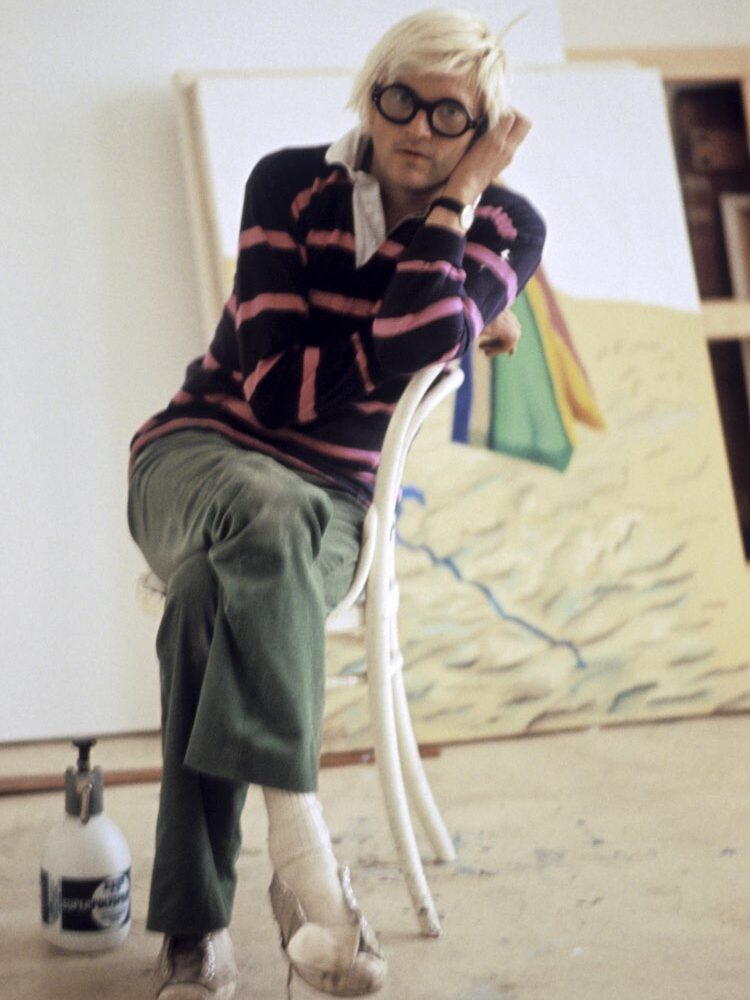 Di tutt’altro genere è la ‘stoffa’ di David Hockney, l’artista inglese che da sempre si veste coloratissimo, come i suoi quadri. In tanti suoi ritratti lo si vede indossare capi rosa, gialli, blu e rossi. Nelle interviste ha sempre ribadito la sua propensione per ‘vivere a colori’. Contraddistinguono il suo abbigliamento gli occhiali grandi tondi, capelli biondo platino, spesso calzini spaiati, maglioncini a righe o in tinta unita sempre sgargianti .“Lo stile”, ha detto Hockney, ” è qualcosa che si può adottare comportandosi come una gazza: prendendo soltanto ciò che si vuole.”