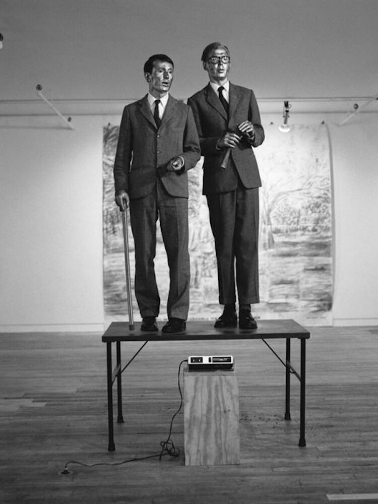 Restando sempre in Inghilterra non possiamo non citare la coppia leggendaria di artisti emersi negli anni ’60, Gilbert & George. Famosa è rimasta la loro esibizione The Singing Scuptures (1969) che sfidava apertamente le convenzioni della borghesia e dell’alta società. Si presentarono vestiti di tutto punto ma con la faccia colorata come se fossero delle sculture di bronzo. Da allora si sono sempre presentati in pubblico elegantemente vestiti come fossero dei veri e propri manichini o automi. Furono chiamati “sculture viventi”.