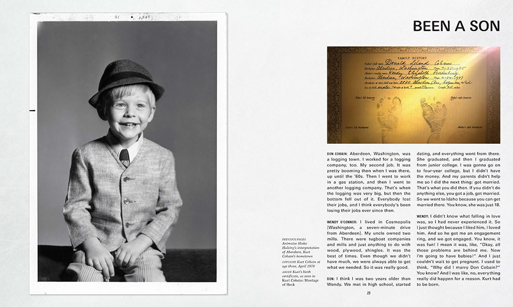 “Ci tenevo che il mio documentario rappresentasse l’estetica di Cobain, il libro ne descrive l’intimità vista dall’esterno” spiega Morgen, che dice di essere stato contattato per questo progetto da Courtney Love, la rockstar moglie di Cobain , e dalla figlia Frances Bean Cobain. Nelle interviste parlano la madre, il padre, altri familiari e le persone che gli sono state più amiche, mentre immagini ripercorrono la sua infanzia, la sua passione per la musica fin da teenager, mescolata a un’irrequietezza interiore. Si scoprono trascrizioni di sue registrazioni e discorsi personali, come si esplora la sua attrazione verso la droga, l’alcol e le esperienze forti.