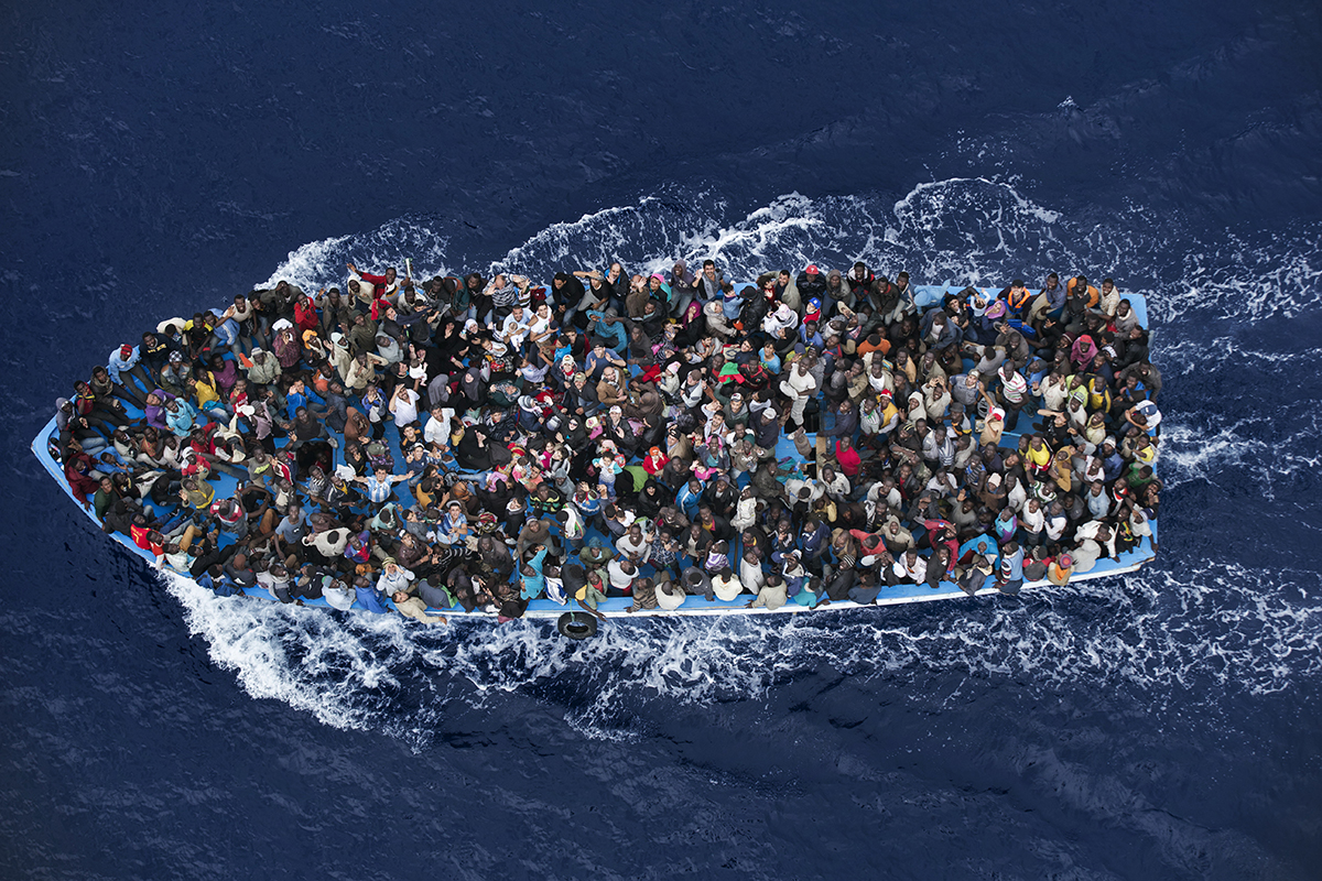 Ha una forza dirompente anche la fotografia che Massimo Sestini ha fatto dall’alto dell’elicottero della Polizia, sorvolando i barconi degli immigrati durante l’operazione Mare Nostrum: fuggiti da terre lontane e martoriate, i migranti, a differenza di quanto è accaduto nella recente tragedia in cui hanno perso la vita oltre 700 persone, stanno composti, conservando una posizione geometrica che fa di loro un tutt’uno con la barca, una cosa sola, un’unica speranza di salvezza.