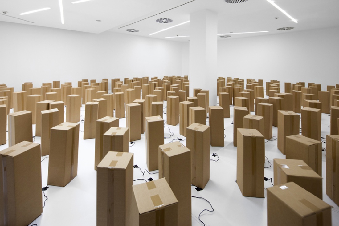 Zimoun. 605 prepared dc-motors, cardboard boxes