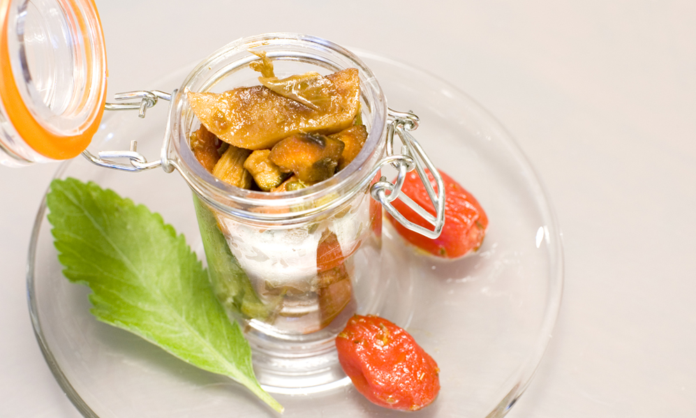 Caponata e Renosu Bianco Dettori. La nota agrodolce della caponata si sposa con l’aromaticità ed il frutto di questo vino a base vermentino e moscato di Sennori.