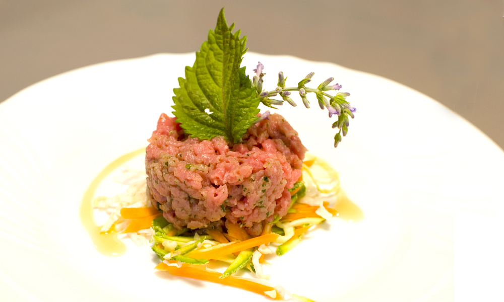 Tartare di fassone e Barbera del Monferrato “Umberta” 2012 Iuli. La dolcezza della carne cruda a contrasto con la caratteristica nota acida della barbera.