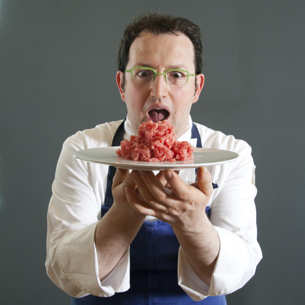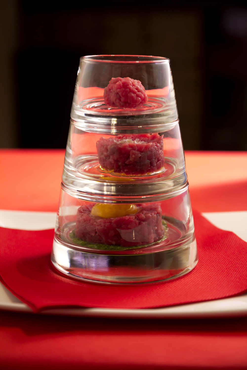 E’ il modo migliore per assaporare il gusto della carne cruda, purché venga servita fredda , a 3°/5°, e assaggiata al naturale. Parola di Sergio Motta, macellaio “senza lustri né lustrini”, che a quella nella storica bottega ha affiancato l’attività di ristoratore. Tavoli con vista spiedo o sulla cella frigorifera, per provare la Piramide, un tris di tartare che parte dalla carne al naturale, passa a sale e olio, per approdare a quella condita con crema di acciughe, capperi e tuorlo d’uovo.
