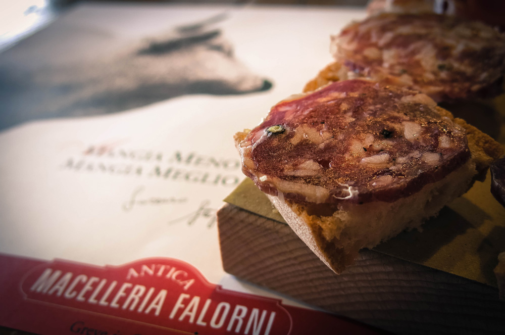 Last but not least, la carne lavorata in salume, di cui è portavoce un’altra realtà toscana, l’Antica Macelleria Falorni. Con la filosofia dell’approccio smart del fast food ma con un prodotto di qualità, in bottega ha creato un punto degustazione con la formula “mangia in macelleria” dove ci si serve in autonomia di taglieri, schiacciate, piatti e calici di vino, da consumare al tavolo in modo informale con un menu tipico del Chianti rivisitato in chiave contemporanea. Ultima novità, il Tagliere del Grigio, salumi ottenuti dal maiale “Grigio” che, come la Cinta Senese, cresce in stato semibrado e prende il nome dalla colorazione rosa-grigiastra, con carne rossa particolarmente saporita e ben marezzata di candido grasso.