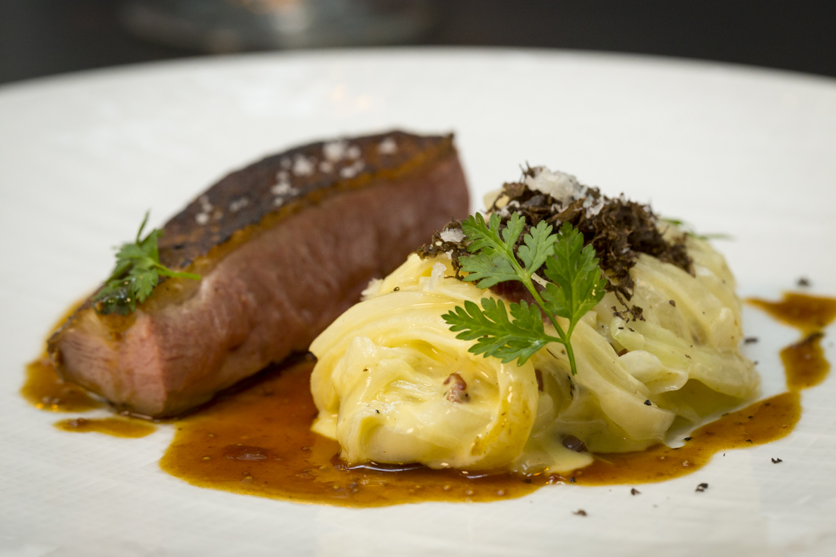 – Petto d’anatra, cipolle alla carbonara, salsa di fico al cacao