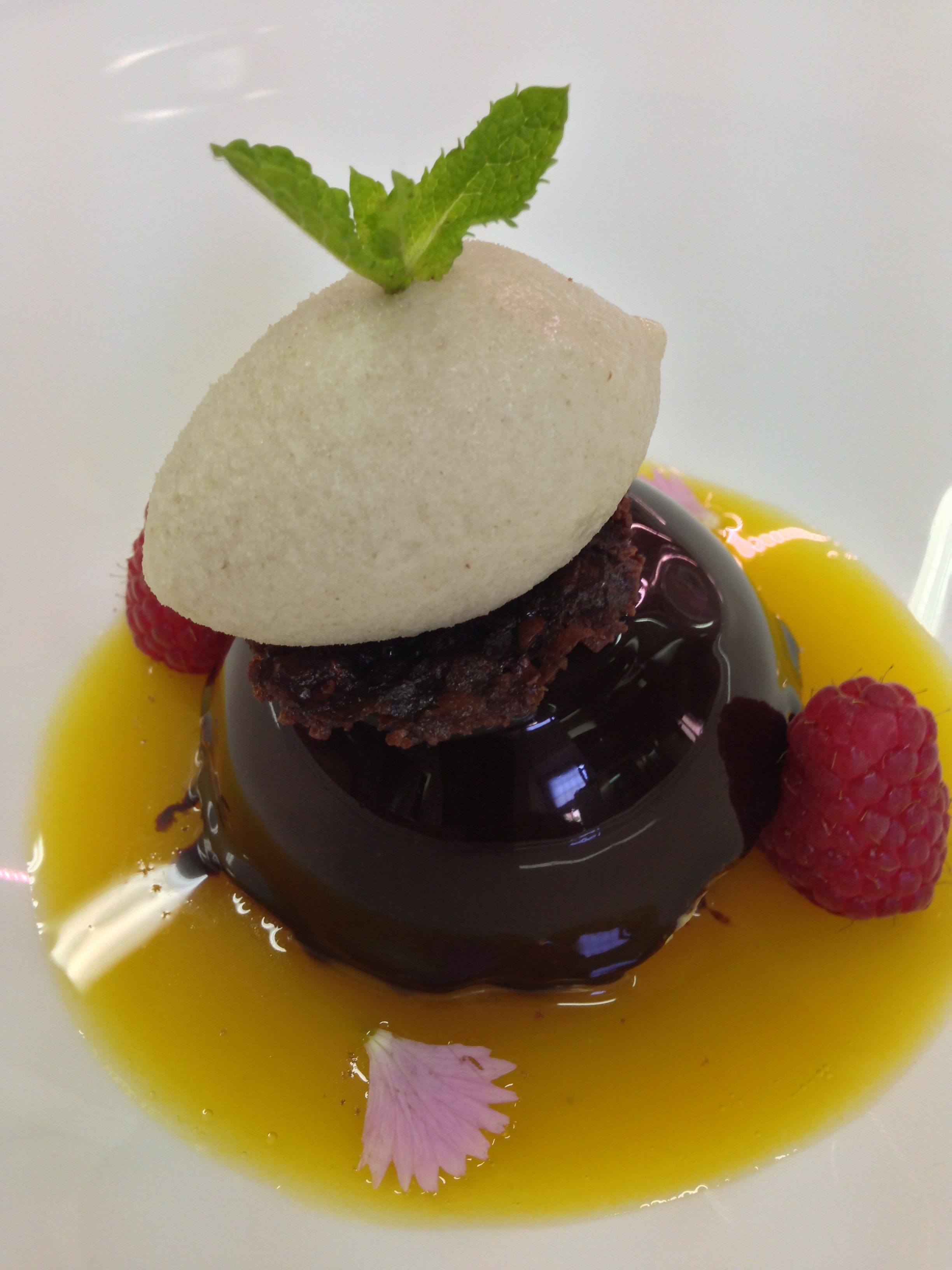 Il vitello e il tonno. Meno pesante e più digeribile del tradizionale vitello tonnato. No alla carne bollita che diventava stopposa e no alla salsa fatta con il tonno in scatola e la maionese. L’idea è di prendere del tonno crudo e marinarlo. Per cuocere a casa in modo uniforme il girello di vitello bisogna chiuderlo in un sacchetto per surgelati e introdurlo nell’acqua bollente. Dopo aver spento il fuoco, lo si lascia immerso per almeno 10 ore. A questo punto si assembla il piatto con il tonno crudo, il girello tagliato sottile, le erbette fresche, i capperi e le acciughe. Come pre-dessert, invece, propongo la mia Biscottata di cioccolato. Nata da un errore, riproposta ancora oggi dopo 15 anni. All’epoca ero cuoco dipendente in un ristorante dove il titolare aveva l’abitudine di invitare gruppi di amici all’ultimo momento. Io, che non amo la pasticceria, nella fretta ho fatto una torta dimenticando di aggiungere il lievito. Il risultato è stato un disco di cioccolato secco che ho rotto grossolanamente facendolo diventare una crumble, a cui ho aggiunto del burro ammorbidito. Messo il composto in uno stampo, l’ho lasciato in frigo come si fa per la base della cheese cake americana.