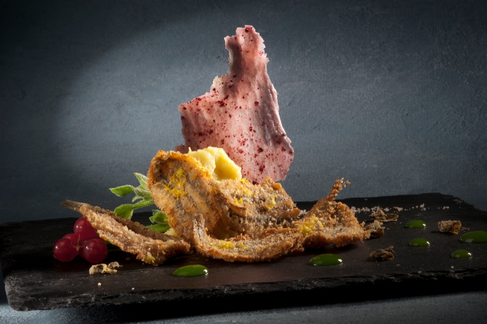 Alici impanate alla milanese, patate all’olio, acqua di prezzemolo, croccante di lamponi (Courtesy of Italian Gourmet)