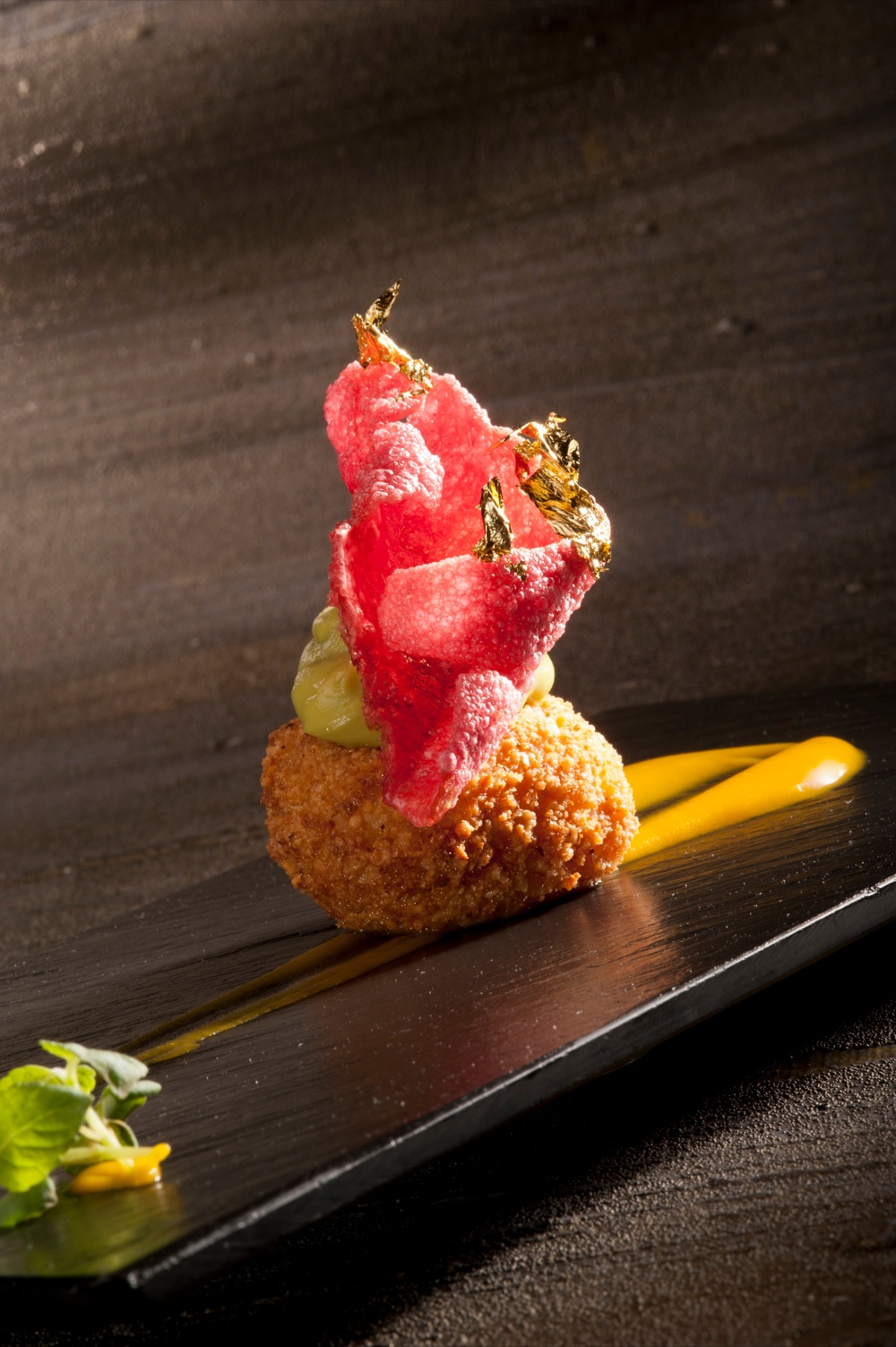 Capesante in crosta croccante di anacardi con guacamole, salsa di zucca, zenzero, cialda di patate e barbabietola (Courtesy of Italian Gourmet)