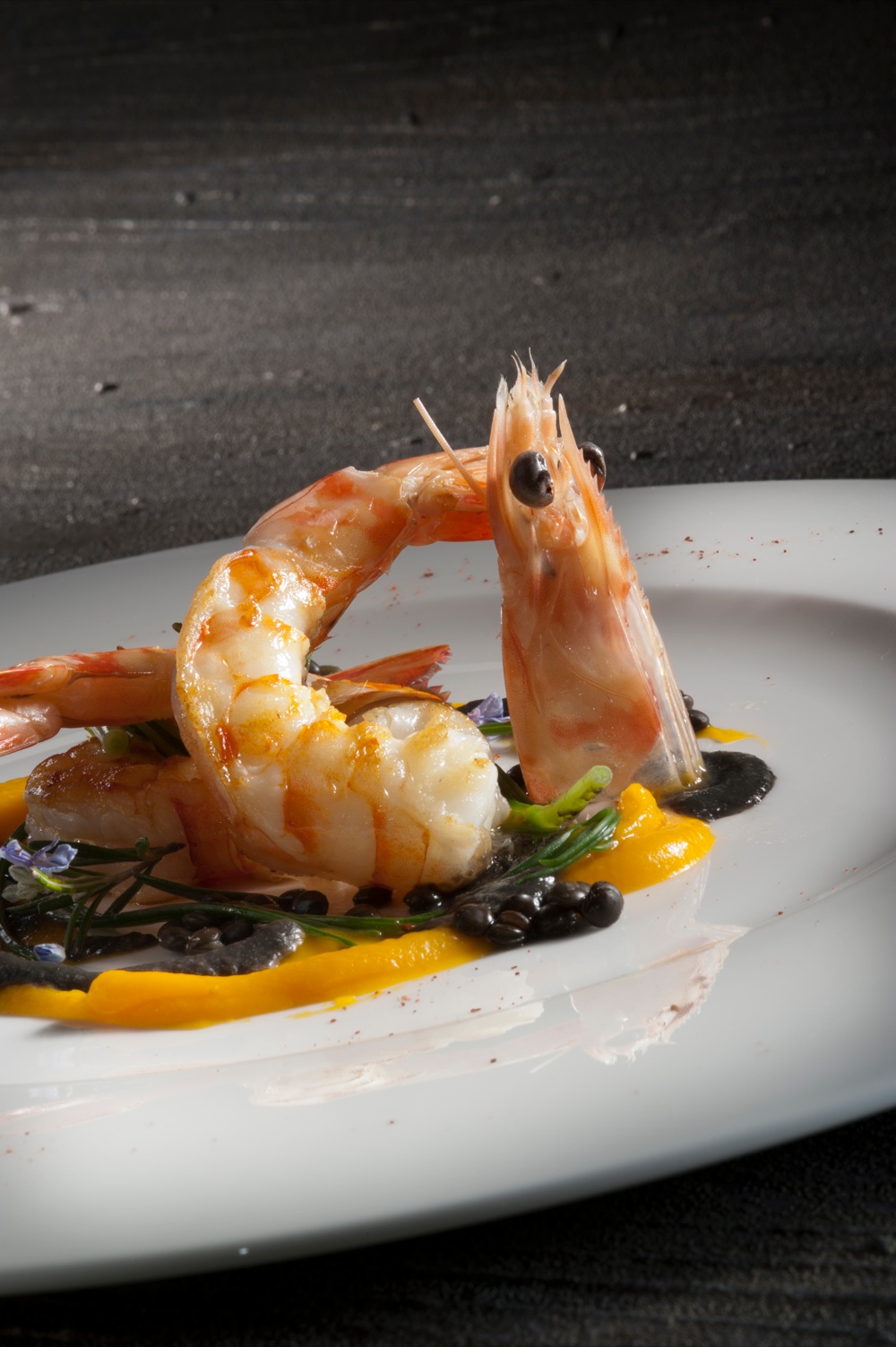 Mazzancolle in padella al rosmarino, crema di lenticchie nere e zucca (Courtesy of Italian Gourmet)