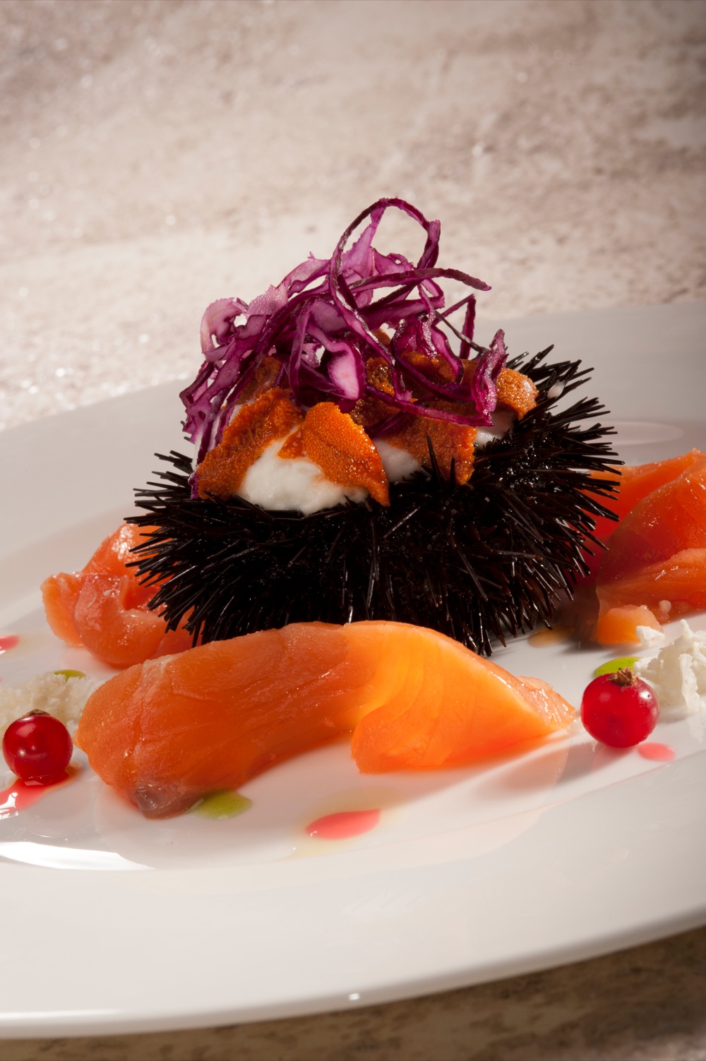 Ricci di mare, spuma di cavolfiore, salmone affumicato al legno di ciliegio e aceto di ribes