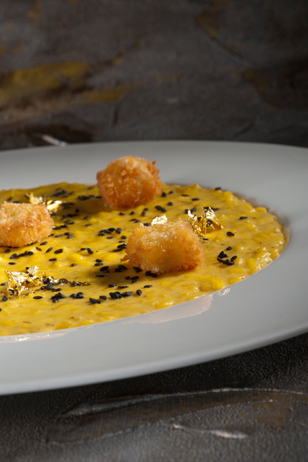 Risotto alla carbonara di mare con guancette di pescatrice dorate, sesamo nero e oro (Courtesy of Italian Gourmet)