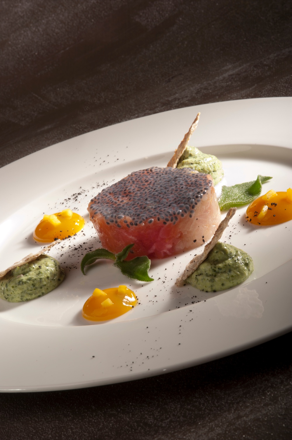 Tartare di ricciola e salmone ai semi di basilico, emulsione di caprino e basilico, crema di mango (Courtesy of Italian Gourmet)