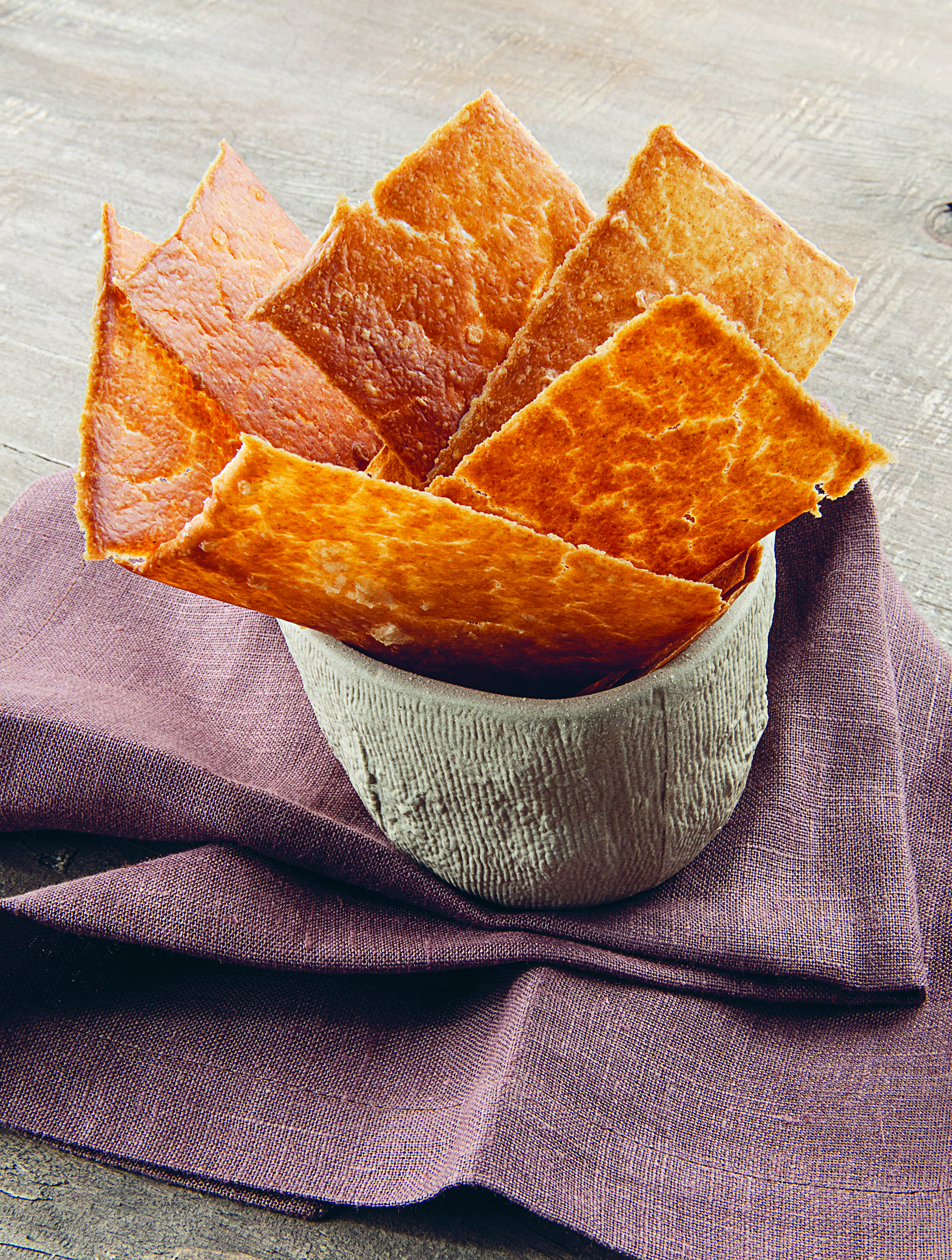 I cracker. “Per chi vuole evitare il pane, i cracker sono un’ottima soluzione, se fatti in casa. Bastano farina, acqua, olio extra vergine d’oliva, lievito di birra e in polvere, sale fino e fior di sale di Ravenna (un sale grezzo e iposodico che dona un aroma particolarmente buono) con cui cospargo i rettangolini di pasta dopo aver fatto lievitare il composto per 30 minuti. Per rendere i cracker quasi trasparenti stendo l’impasto sulla placca da forno con un pennello da cucina rigido. Inforno a 200° C per dieci minuti e servo a fine pasto perchè i cracker sono un carboidrato utile soltanto a riempire lo stomaco e a deliziare il palato”.