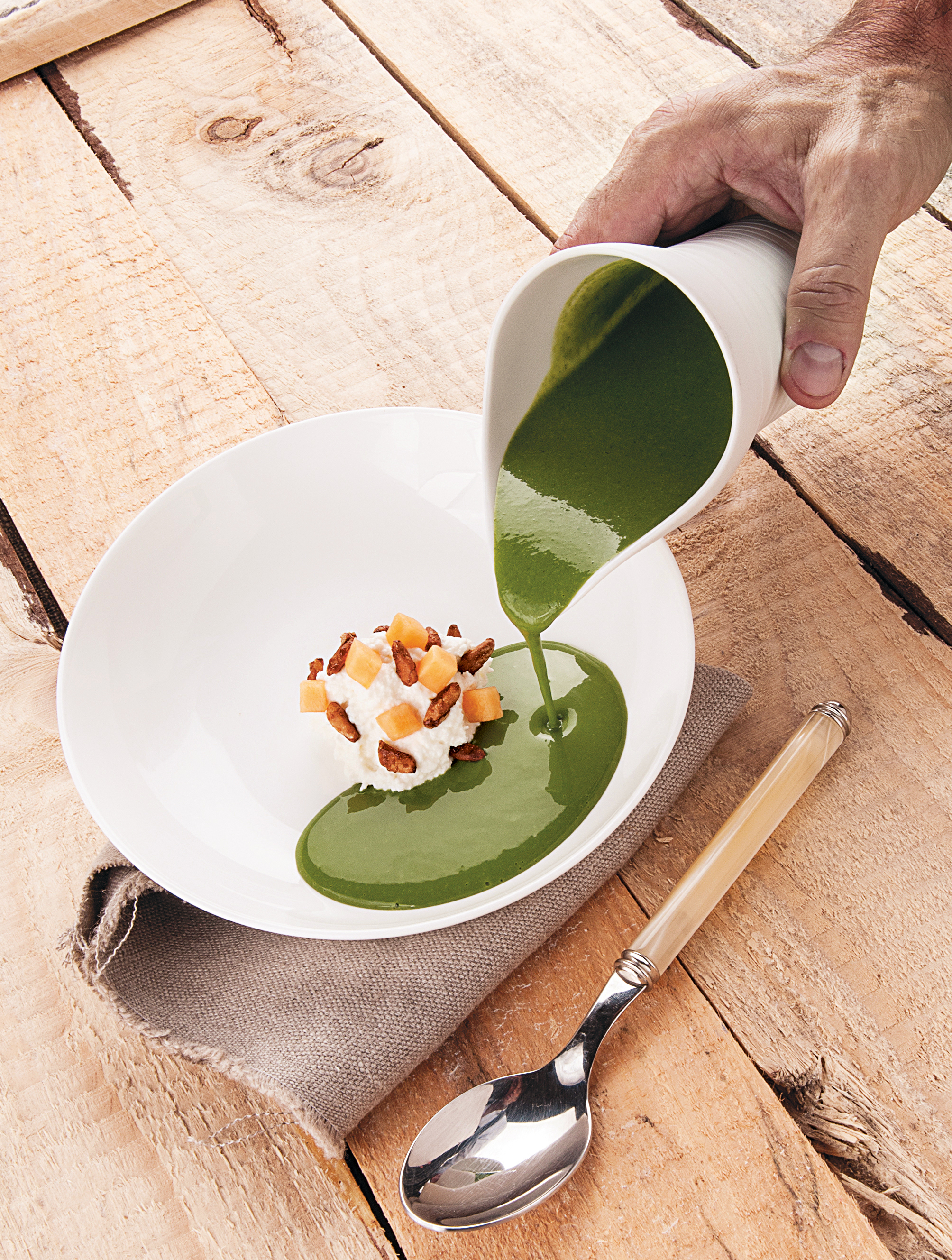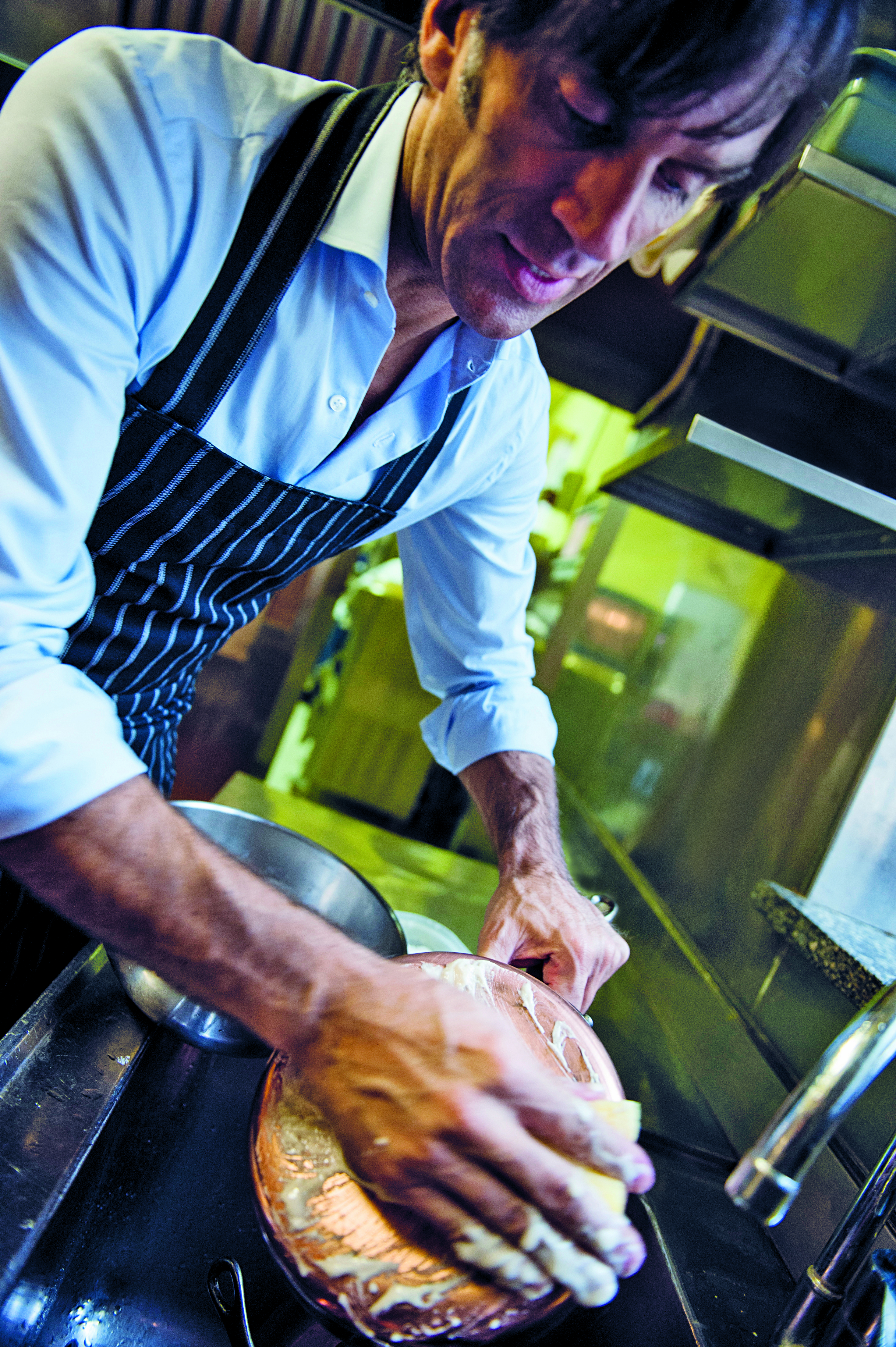 Il riso giusto. “L’ho chiamato riso, attenzione, non risotto. Lo faccio infatti cuocere senza soffritto né vino bianco e in poca acqua a freddo, in modo che sia leggero. Poi lo manteco con una noce di burro e poco parmigiano perché voglio sentire il profumo dei latticini. Aggiungo un goccio di aceto di vino bianco. Servo a parte un brodo molto ristretto, da bere. Per preparare un buon riso una pentola di rame stagnato è l’ideale”.