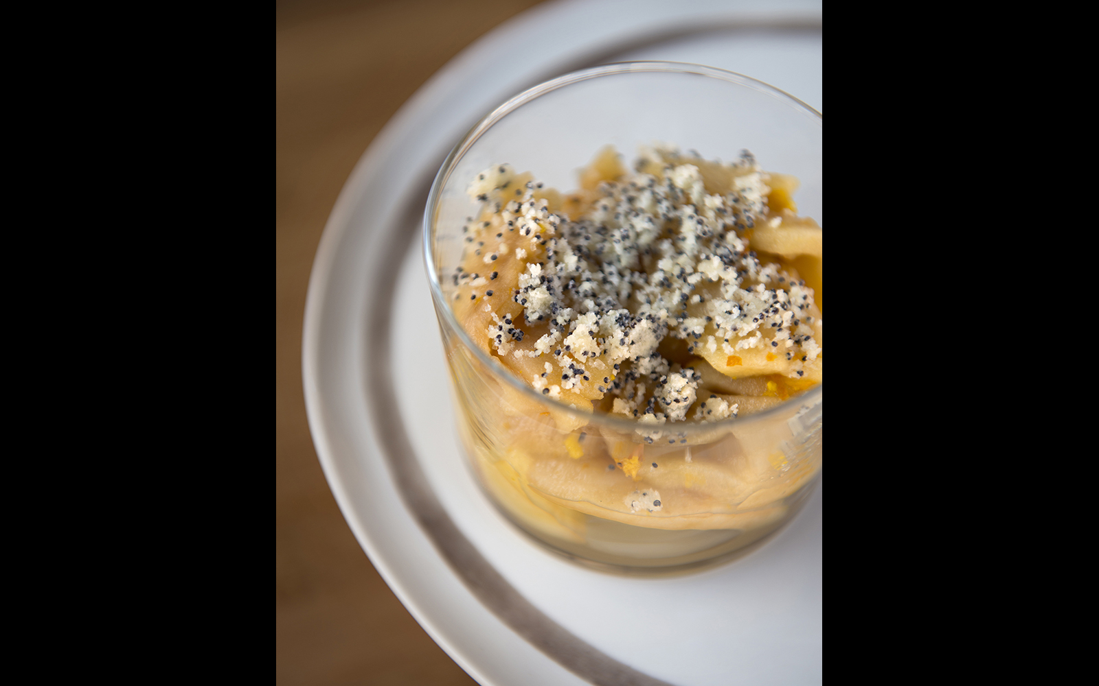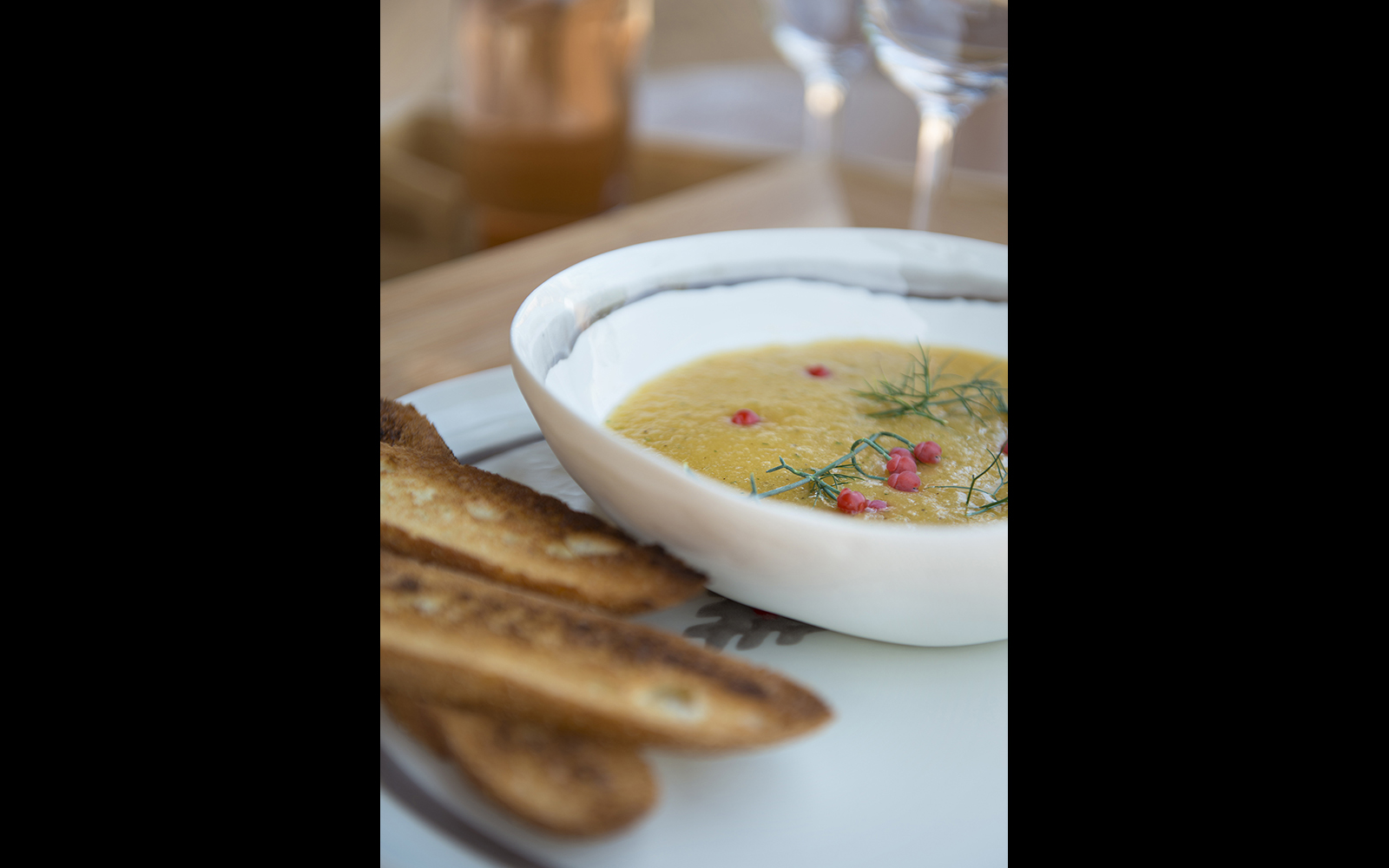 Fra i piatti, Crostini di formaggio di capra di Skoura con caramello e datteri, la Zuppa di zucca all’essenza di zenzero, la Tajine di pollo profumata al curry invecchiato e per chiudere una Pastilla al cioccolato, gelato alla cannella, frutta secca e pistacchi.