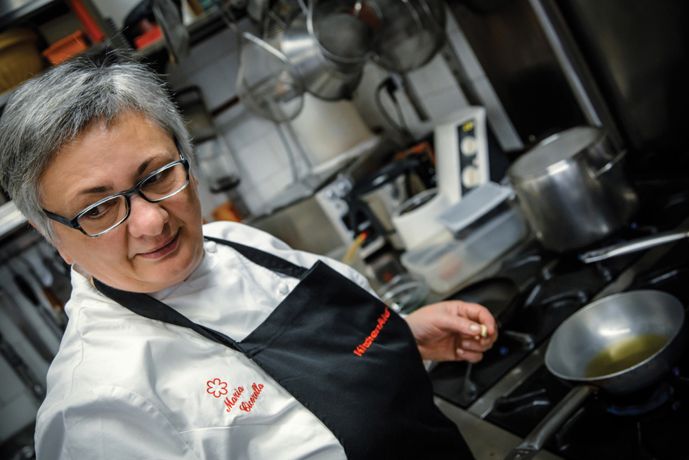 ‘Inizialmente mio figlio ha avuto dei dubbi: il lavoro era impegnativo, soprattutto per gli orari. Ma da brava moglie e mamma mi è venuto spontaneo farmi avanti. È cominciato tutto da lì: mi piaceva, avevo le mie soddisfazioni e quindi, per migliorarmi, approfittavo dei piccoli momenti liberi per documentarmi acquistando libri di grandi chef. Essendo autodidatta non conoscevo certe tecniche. Sapevo cucinare a casa, questo sì, ma un ristorante è ben diverso. Così ho iniziato a studiare seriamente, a frequentare corsi e insomma eccomi qua: non sono ancora uscita dalla cucina’.