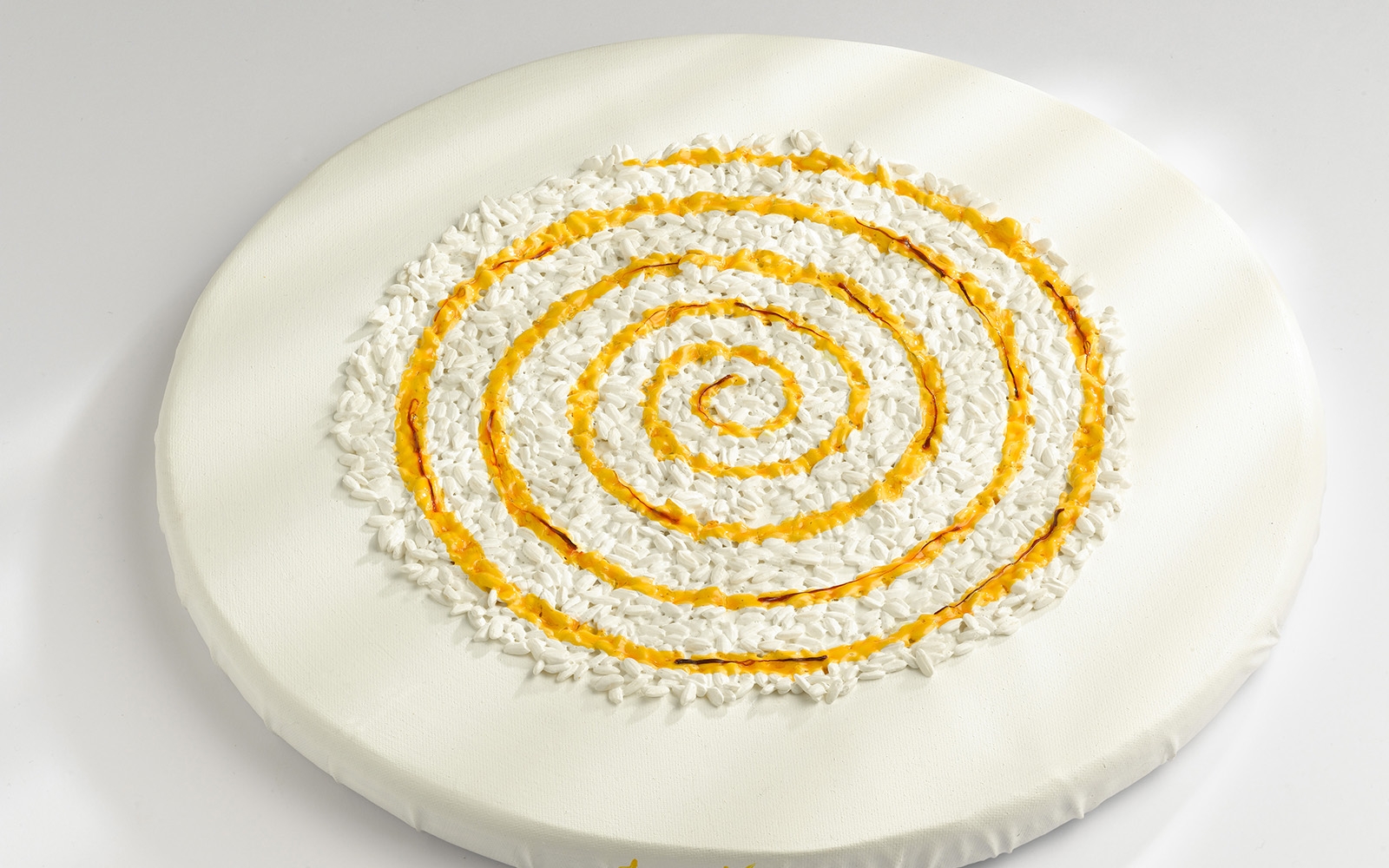 Stendete il riso su un piatto piano (Solaria, Assiette D’O), versate a spirale la salsa di zafferano con l’aiuto di un cucchiaio, al centro adagiate il midollo precedentemente arrostito in un padellino, completate cospargendo con il sale Maldon.