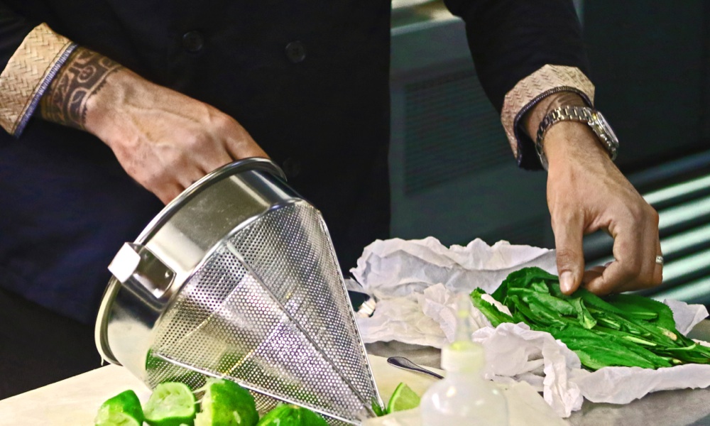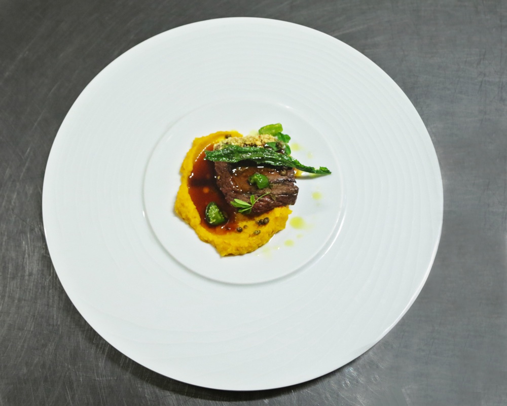 «E così ho scelto un ingrediente che mi rappresentasse, il diaframma, a cui ho abbinato spezie e sapori locali». Il taglio di carne è stato prima cotto su una brace ricavata dal legno delle botti in cui ha riposato Zacapa imbevute dello stesso liquido, poi appoggiato su una crema di ayote, una zucca dolce e corposa, e accompagnato poi da tomatillo canditi, foglie di chipilin e condito con una salsa au jus alle nocciole che, grazie alle loro note tostate, rievocano alcuni aromi del rum.