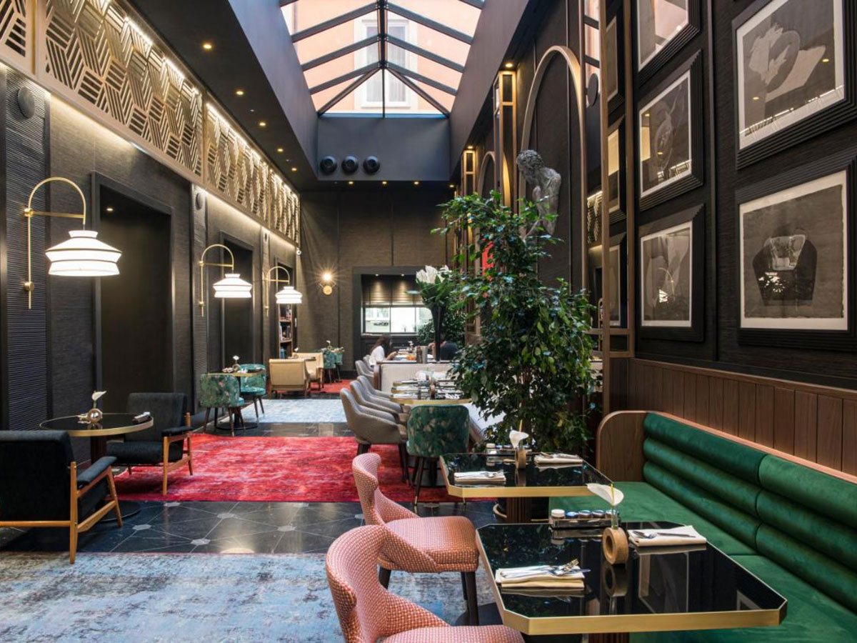 Gli interni, curati con maestria dallo studio Claudio Nardi Architects, presentano legni scuri, quadri preziosi, ceramiche smaltate, drappeggi intensi, metalli inattesi. Un imponente lucernario sovrasta la sala principale dall’ampio bancone. Ovunque si è abbracciati dalla meraviglia, che si fa maestosa nel cortile secentesco. Un dettaglio che riempie il cuore? Qui visse e creò Gian Lorenzo Bernini.