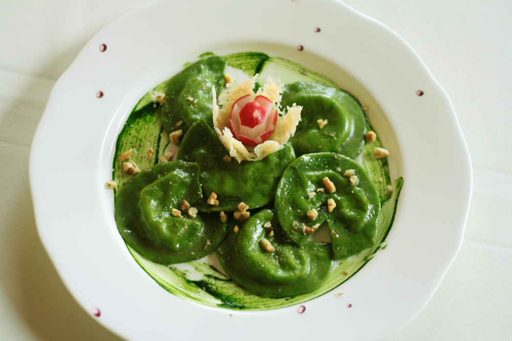 Ad esempio la frittura di acqua delle cosce di rana e alghe di porro con polentina morbida di mais Marano che riprende i colori del dipinto ‘Lo stagno delle ninfee, armonia verde’ (1899). Oppure l’omaggio a ‘Ninfee’ (1906): ravioli verdi ripieni di lucioperca con granella di noci al burro biondo (se non si ama il pesce possono essere chiesti con un ripieno di formaggio caprino).