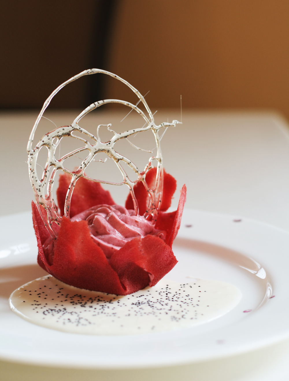 Non è da meno il dolce, ispirato al quadro del 1873 ‘I papaveri’: una cialda rossa croccante con parfait al lampone e crema di latte ai semi di papavero.