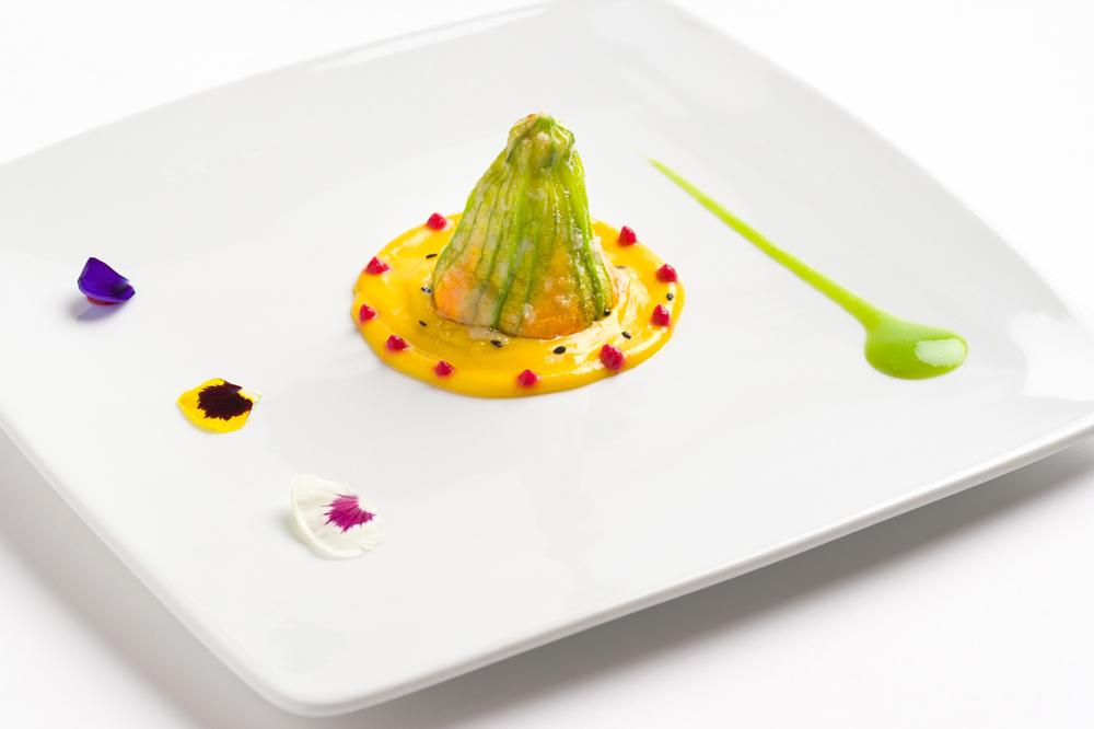 La particolarità di questo contesto si riflette nella cucina, perché Gianni Tarabini organizza anche servizi di catering, ricevimenti matrimoniali e gestisce entrambi i ristoranti della Fiorida, il Quattro Stagioni e quello stellato, La Présef. È in quest’ultimo che ‘tutto quello che sappiamo sulla ristorazione viene declinato con un po’ di creatività, partendo sempre da prodotti semplicissimi e locali. Quindi non cuciniamo l’aragosta o lo storione, ma le patate di montagna, il topinambur, il pesce di lago, i funghi. Anche i tartufi della zona: nessuno lo sa, ma ce ne sono parecchi’.