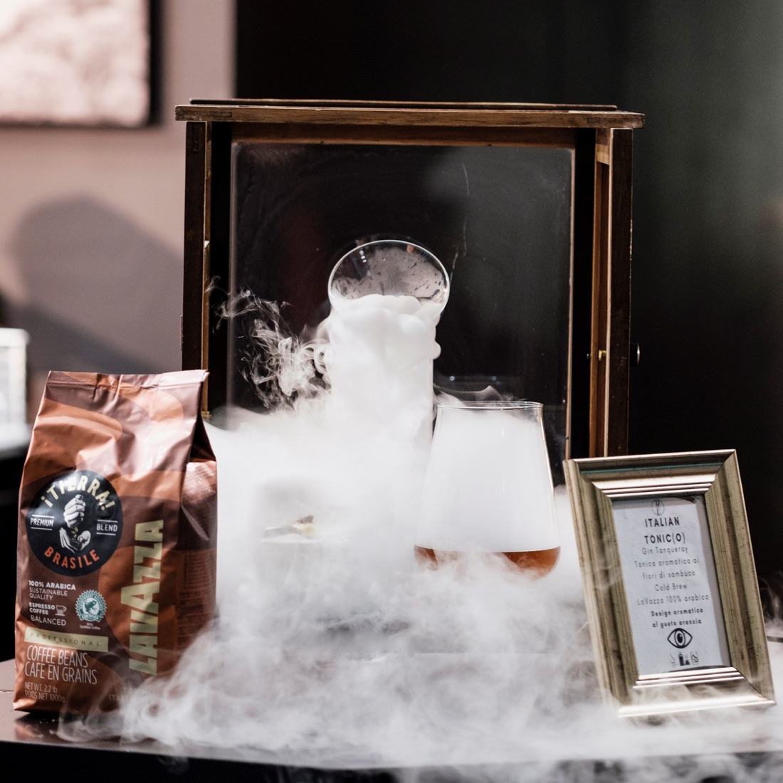 Drink analcolico a base di Lavazza iTierra! Brasile che si ottiene mettendo nello shaker gli ingredienti (30 ml caffè 100% Arabica Cold Brew e 120 ml di tonica aromatizzata ai fiori di sambuco) e agitando bene il tutto. Per chi vuole l’abbinarlo può servirlo con al cioccolato aromatizzato al gusto di champagne.