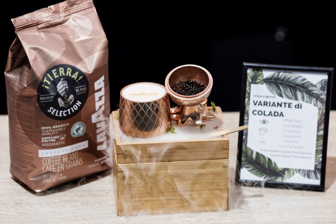 Si frullano avocado, spezie, succhi e rum fino ad ottenere un composto omogeneo da versare nel blender. Poi si fa raffreddare il tutto attraverso un graniture che rende la miscela fresca e cremosa. A questo punto si prepara la schiuma cominciando con l’estrarre il caffè Lavazza iTierra! Selection attraverso la moka e aspettando che si raffreddi. Ora si versano 300 ml di caffè in un contenitore di plastica e si aggiungono 1,5 grammi di lecitina di soia in polvere, 20 ml di sciroppo di zucchero e 100 ml di acqua. Poi si frulla nuovamente tutto e si inserisce il tubo dell’aeratore nel contenitore in plastica. La macchina crea delle bolle che decorano il drink. Per gli ingredienti: 200 ml di succo di Guanabana, 100 ml latte di cocco, 40 ml di rhum agricolo Dillon, 50 ml di sciroppo di cocco, cannella e cardamomo in polvere, avocado