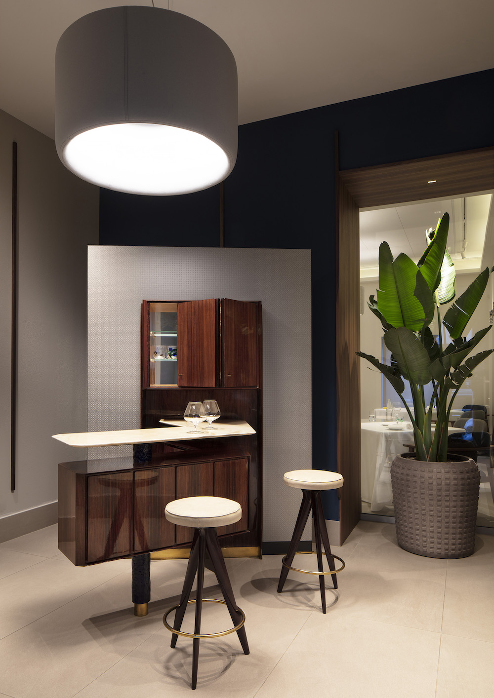 Fuori categoria, per via di un paio di stelle Michelin già guadagnate, Il luogo di Aimo e Nadia, da poco ristrutturato dallo studio Vudafieri- Saverino Partners: i 240 mq del ristorante guadagnano in teatralità, grazie a quinte create ad arte, arricchite da riferimenti al design degli Anni 50, come nel mobile bar in legno con ripiano in marmo firmato da Osvaldo Borsani o dalle specchiere irregolari, pezzi unici ad opera di Giampiero Romanò. E come in un teatro, a nascondere alla vista gli elementi ci pensano bacchette in legno di noce a tutta altezza dietro le quali si celano ante apribili e armadi. Il Theatrum dei sapori, è invece la novità: luogo dove si terranno masterclass e incontri, mette al centro un tavolo in legno di cedro con base in ferro, mentre l’illuminazione firmata da Antonangeli si fa elemento decorativo, traslandosi su lampade che scendono dal soffitto o oggetti luminosi rivestiti con foglie di rame. Nei piatti, la ricerca della materia prima perfetta incontra l’estro creativo dei fondatori: da provare il Risotto con radicchio tardivo di Treviso, pralinato di nocciole Tonda Gentile e funghi porcini secchi dell’Abetone, o i Tortelli farciti di ossobuco di Fassone e midollo nel suo ristretto, allo zafferano sardo e parmigiano.