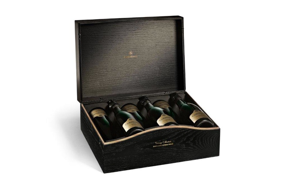 Le pregiate bollicine di casa nostra vengono proposte con una preziosa cassa in legno realizzata in tiratura limitata (3000 pezzi in tutto il mondo): è in sostanza una degustazione verticale (cioè più annate dello stesso prodotto) del nuovo Franciacorta Vintage Collection Dosage Zéro Noir, un’esclusiva natalizia di Ca’ del Bosco per veri intenditori. L’unica occasione per degustare tutte insieme le annate esistenti: 2005, 2004, 2001.