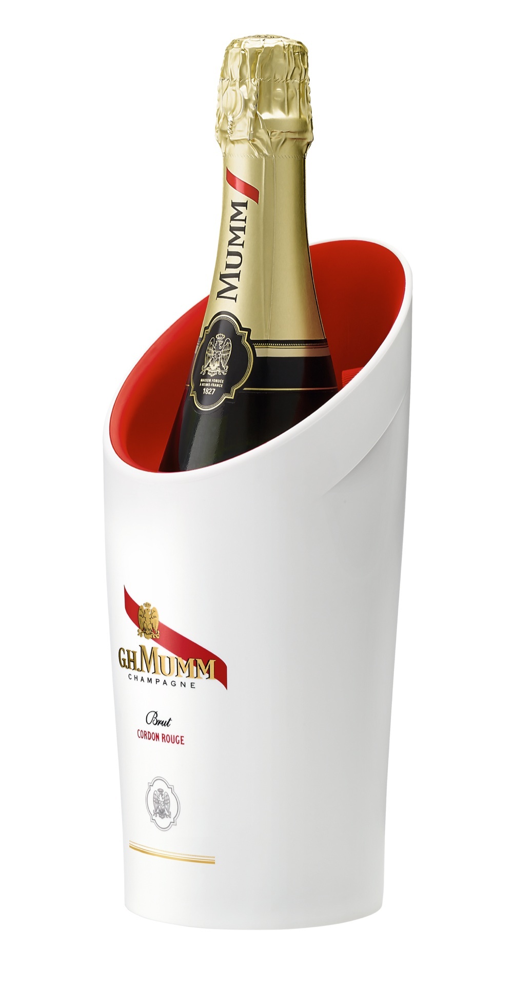 Il vigore del Pinot Noir, la spumeggiante allegria della Cuvée l’ispirazione del G.H. Mumm Mini Ice Bucket, la prima glacette che avvolge come un abito la bottiglia, messa a punto per creare un microambiente ideale per proteggere dagli sbalzi termici la Cuvée Cordon Rouge: un elisir giallo dorato dai riflessi di giada, vivace e fresco, frutto del sapiente assemblage di ben 77 fra i migliori cru di Francia. Alternativa non convenzionale alla bottiglia classica, è stata creata quest’anno la F1 Gold Edition,
