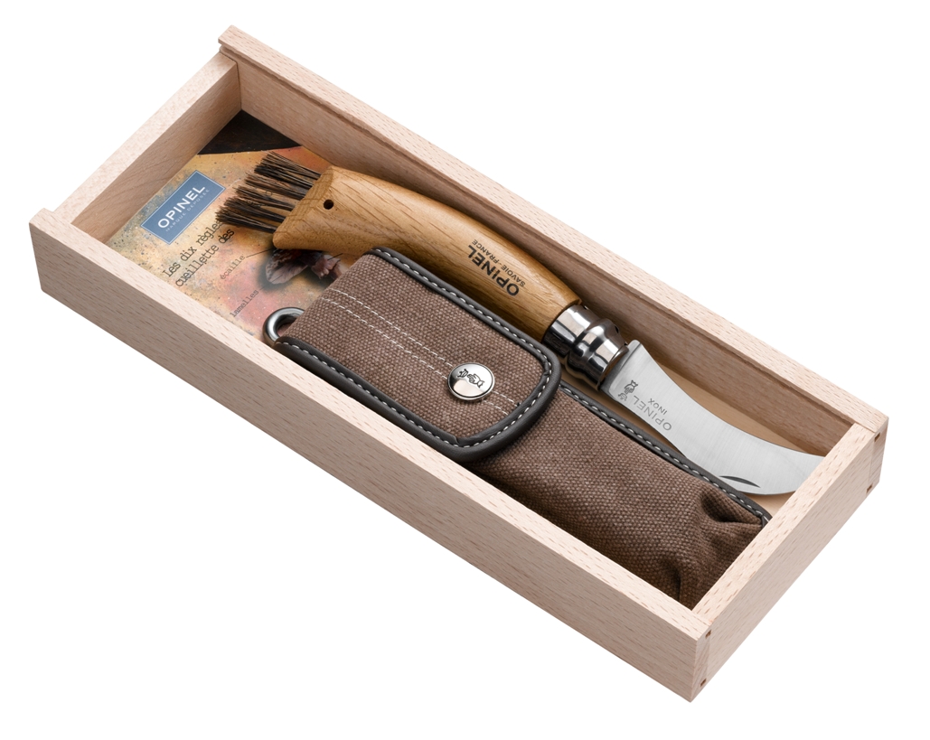 Andar per funghi con Opinel L’elegante confezione regalo in legno della casa francese racchiude un coltello per la raccolta funghi o per qualsiasi altra attività nel bosco. Oltre all’acciaio di ottima qualità della lama, questo coltello può essere riposto in qualsiasi tasca grazie al suo fodero in canapa. Ideale anche per rifinire il tartufo nello scavo (o magari per affettare qualcos’altro durante le escursioni) il coltello è dotato anche di spazzolino per rimuovere la terra.